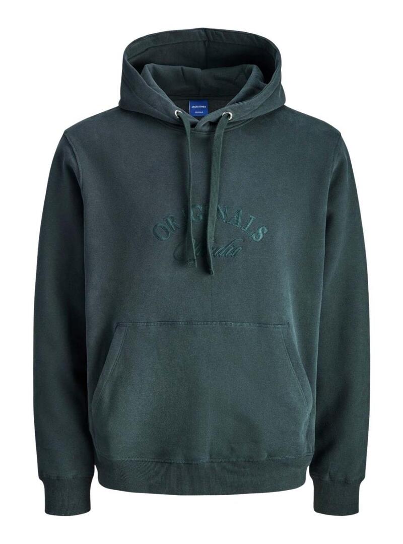 Felpa Jack and Jones. Colore verde. Maniche lunghe. Cappuccio regolabile con cordini. Logo ricamato tono su tono sul petto. Finiture a costine. Fit rilassato.