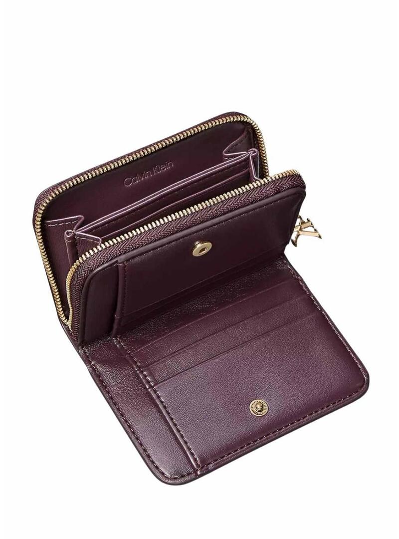 Portafoglio Calvin Klein. Colore bordeaux. Chiusura con zip e bottone a pressione nella parte anteriore. Slot per carte. Dettaglio del pendente CK sulla cerniera. Logo nella parte anteriore. Viene fornito in una scatola.