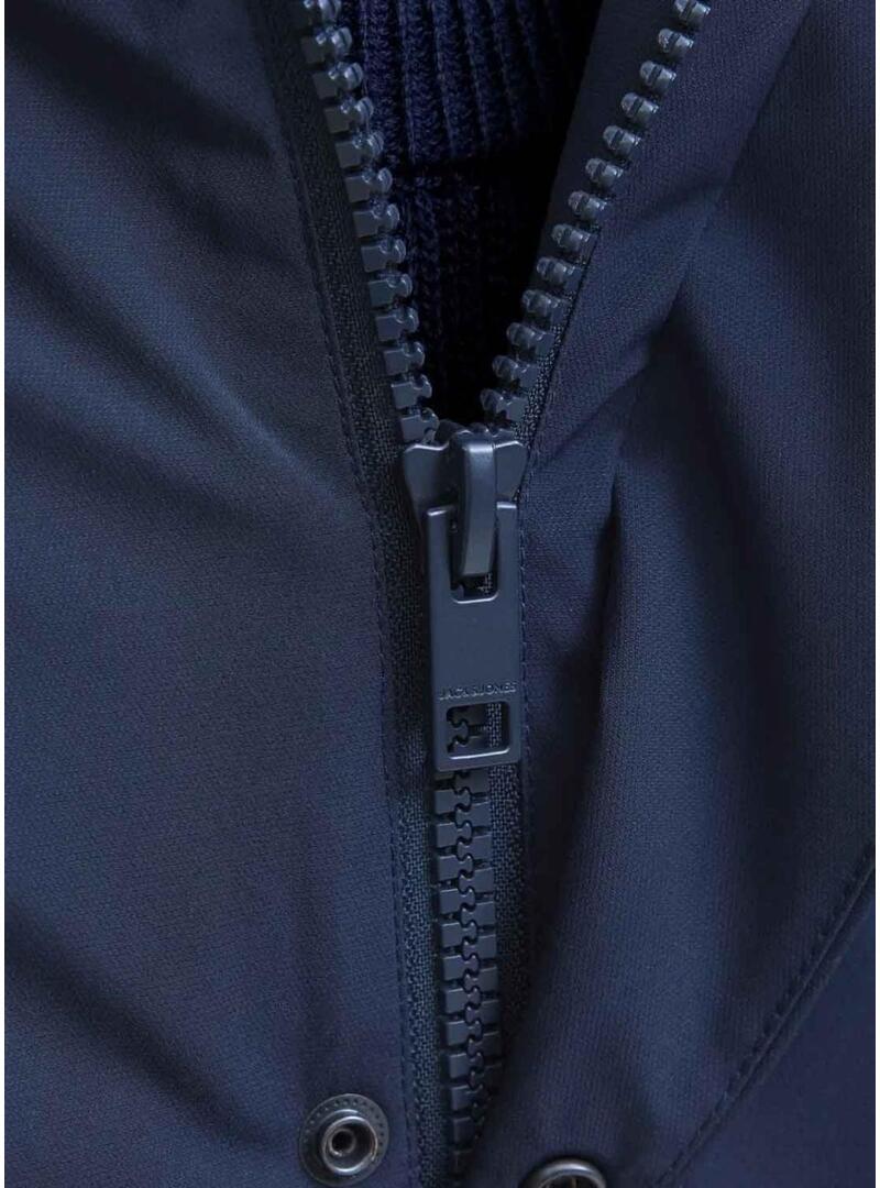 Parka Jack and Jones. Modello Ekeen. Colore blu. Tessuto shell isolante e caldo. Resistente all'acqua. Cappuccio con coulisse regolabile. Maniche lunghe. Orli a costine. Tasche anteriori. Chiusura con zip nascosta. Imbottitura in piuma sintetica.