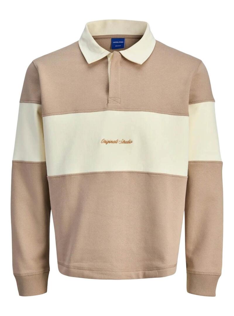 Polo Jack and Jones. Modello Norrebro. Colore cammello e beige. Stile rugby. Stampato a righe orizzontali. Colletto da camicia con chiusura a bottoni nascosta. Etichetta laterale. Estremità delle maniche a costine. Logo ricamato.