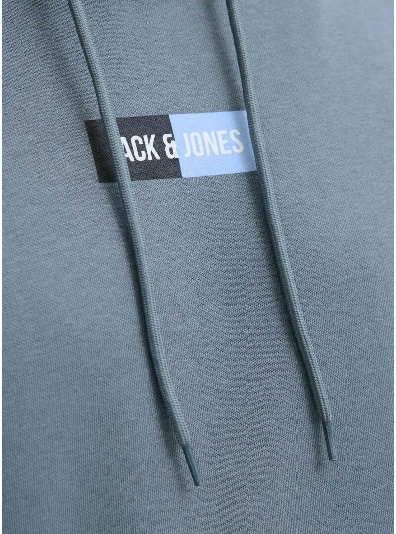Felpa Jack and Jones. Modello Pan. Colore blu. Orli a costine. Cappuccio con coulisse regolabile. Logo del marchio stampato sul petto. Vestibilità regolare. Tasca a marsupio.