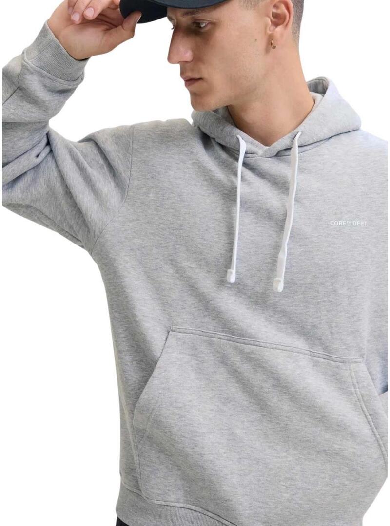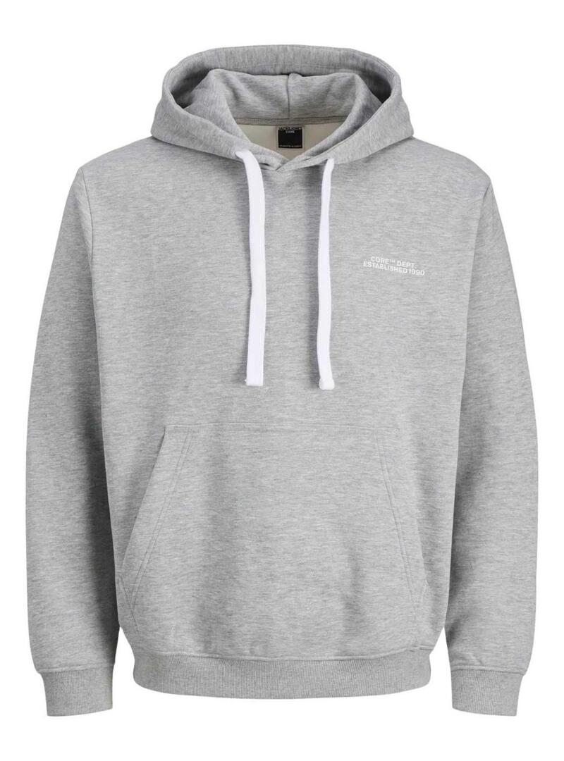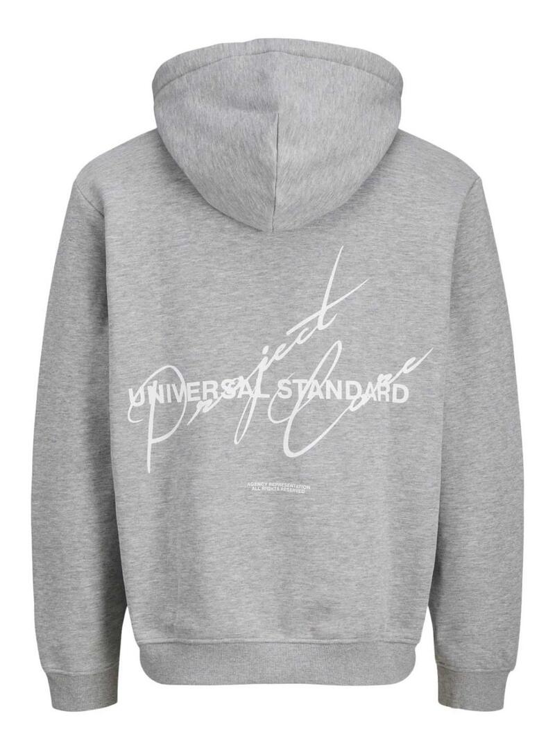 Felpa Jack and Jones. Modello Cocover. Colore grigio. Cappuccio con cordino extra largo regolabile. Tasca marsupio. Taglio largo. Estremità a costine. Messaggio stampato sul petto e sulla schiena. Dettagli in bianco.