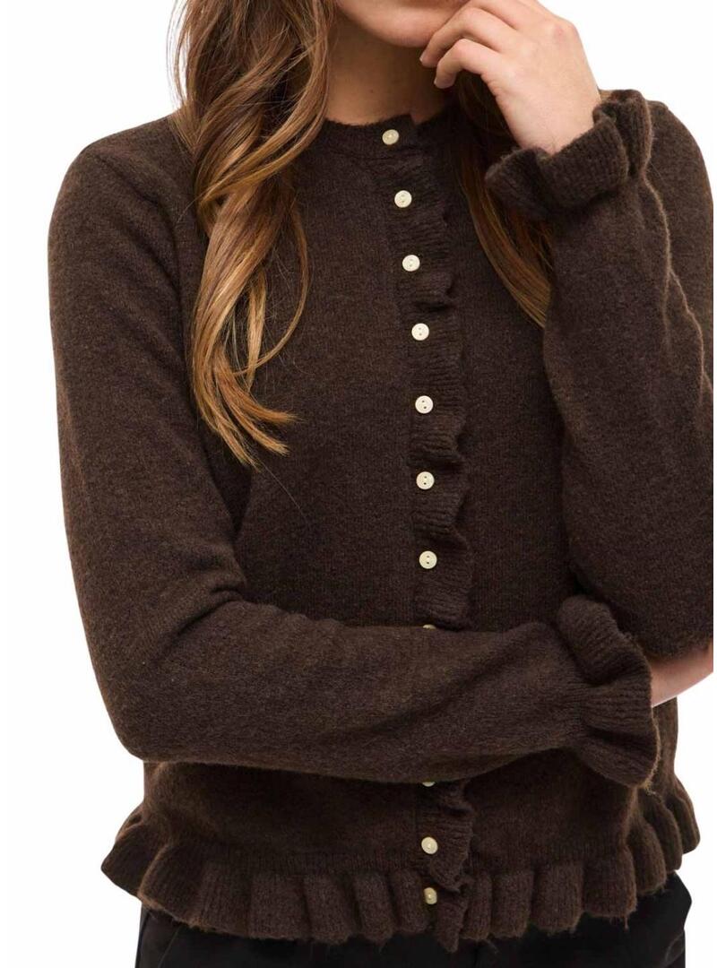 Giacca Vila. Colore marrone. Collo rotondo. Manica lunga. Maglia. Chiusura con bottoni. Dettagli a volant. Formato regolare.