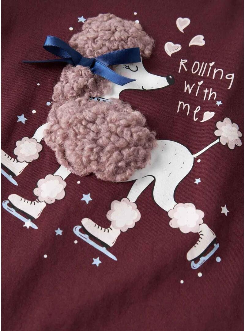 Maglietta Name It. Modello Frakerna. Colore bordeaux. Collo rotondo. Manica lunga. Vestibilità regolare. Illustrazione di barboncino stampata sul davanti con dettagli in rilievo.