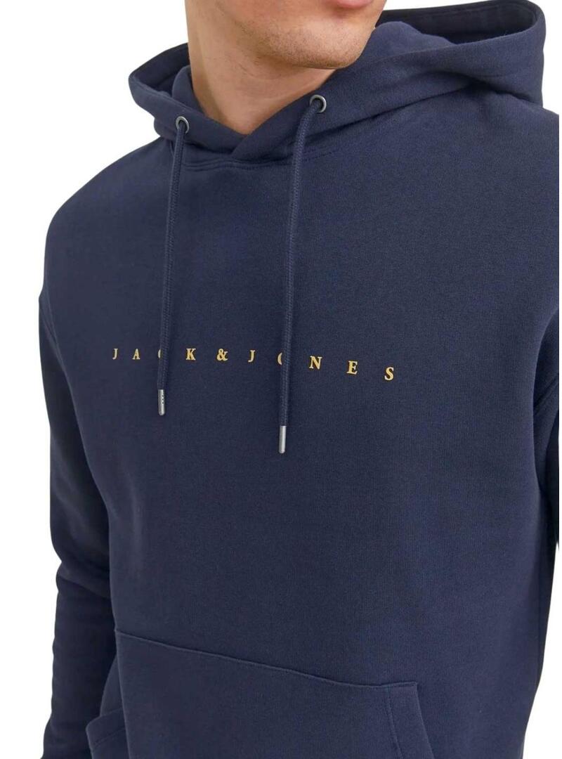 Felpa Jack and Jones. Modello Estar. Colore blu scuro. Cappuccio con lacci regolabili. Orli a costine. Tasca a marsupio. Logo stampato sul petto. Vestibilità regolare.