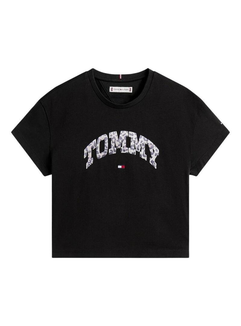 Maglietta Tommy Hilfiger. Modello Varsity. Colore nero. Girocollo. Manica corta. Vestibilità regolare. Marchio satinato con stampa animalier sul davanti. Logo ricamato sulla manica.