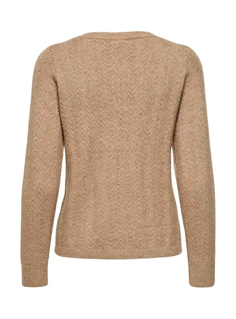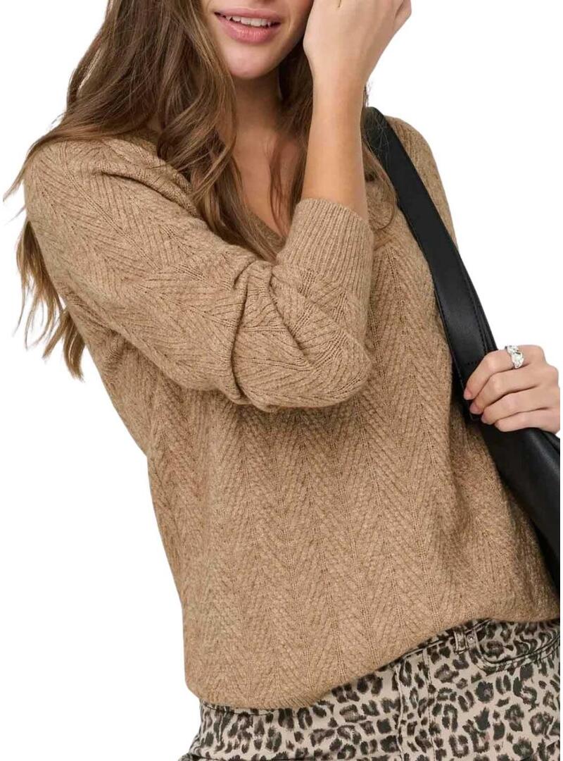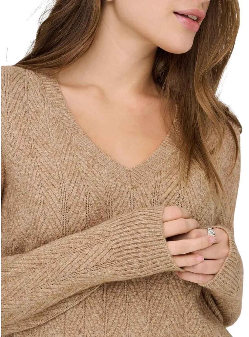 Maglia Only. Modello Hellen. Colore beige. Tessuto a maglia strutturata. Collo a V. Manica lunga. Taglio regolare. La modella indossa la taglia S.