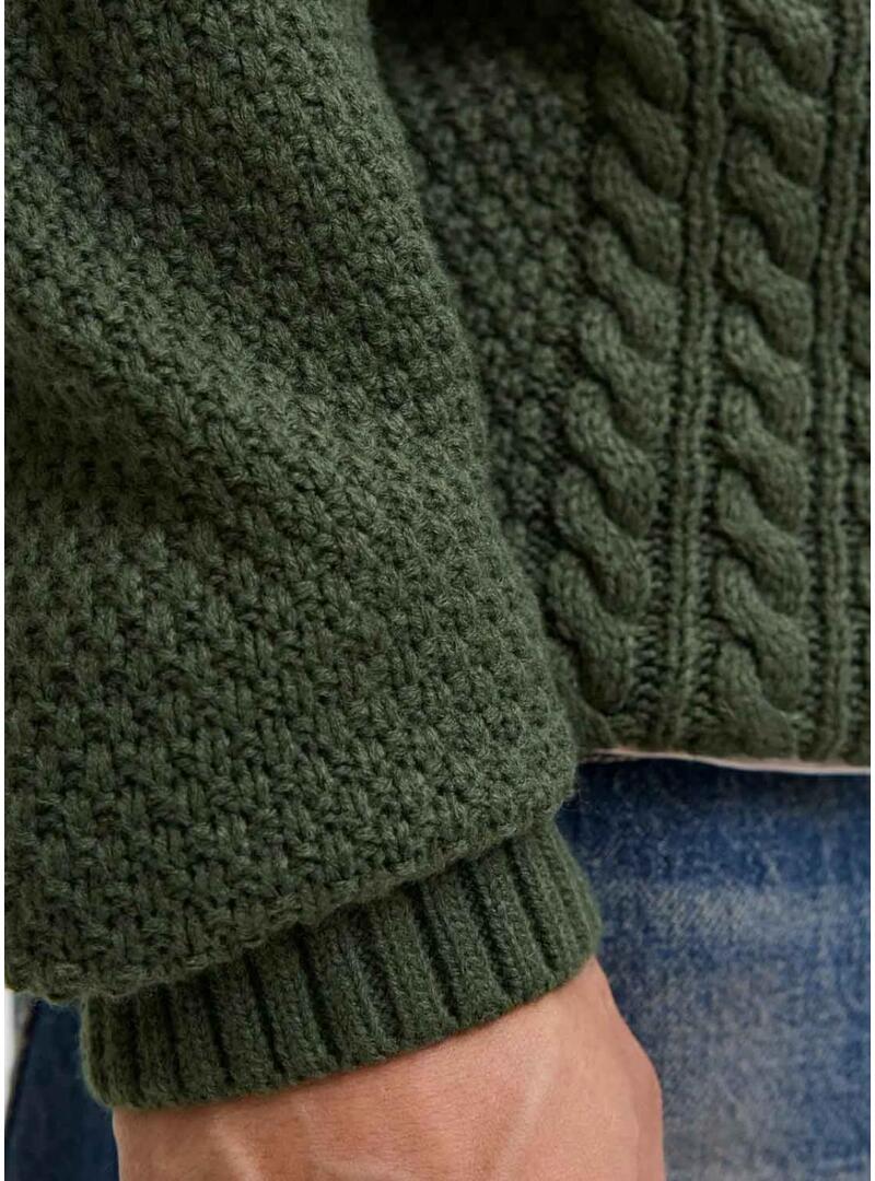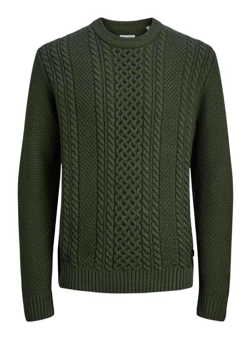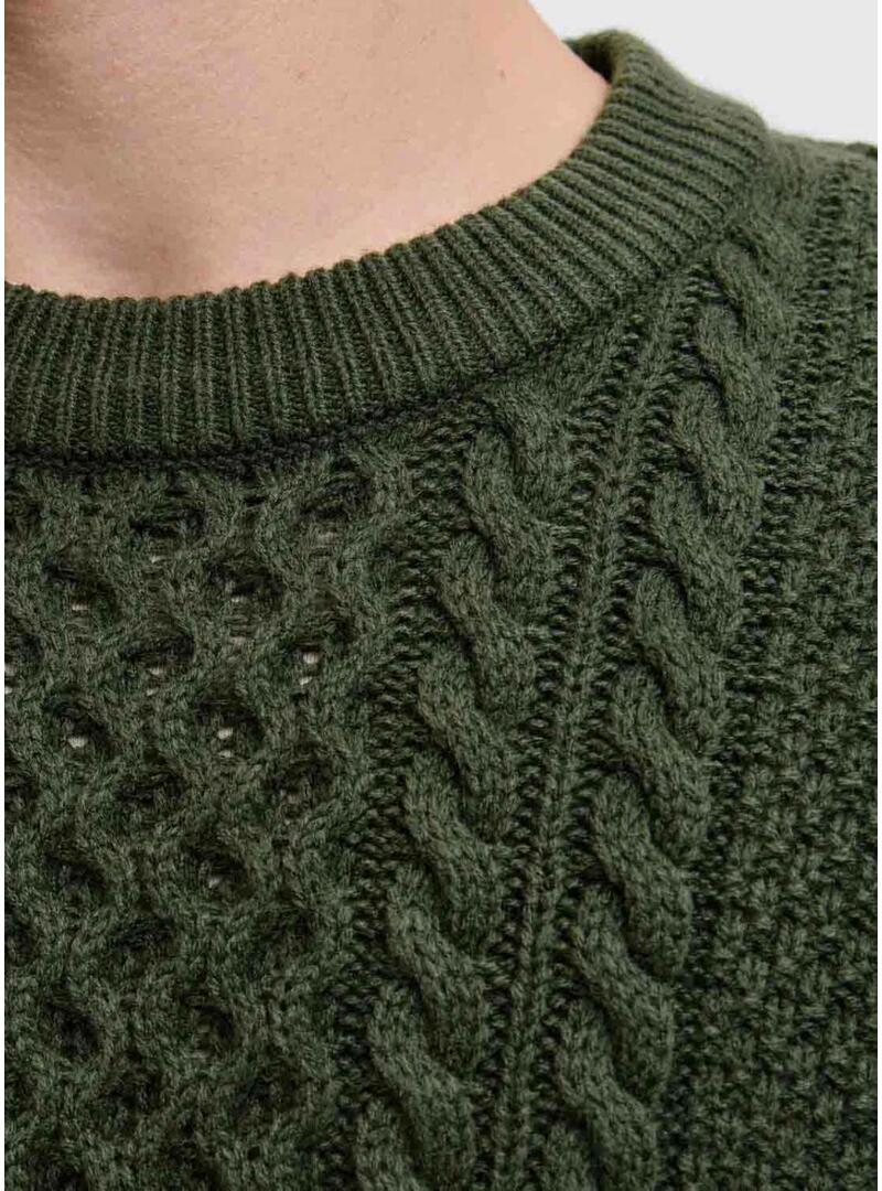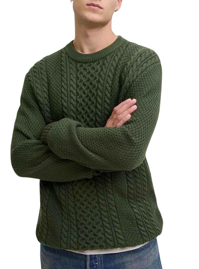 Maglia Jack and Jones. Modello Paul. Colore verde. Taglio regolare. Collo rotondo. Manica lunga. Rifiniture a costine. Tessuto strutturato. Dettagli intrecciati. Il modello indossa la taglia L.