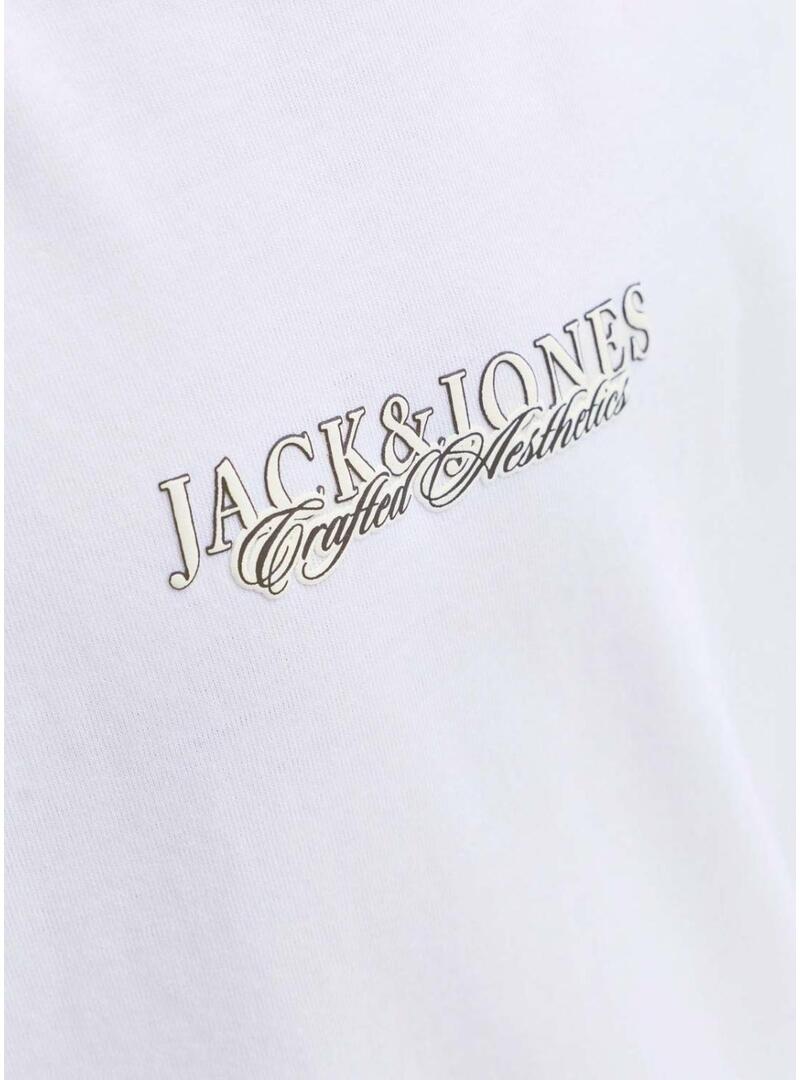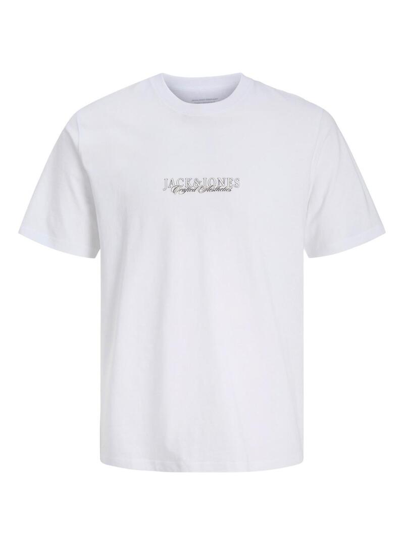 Maglietta Jack and Jones. Modello Bleecker. Colore bianco. Colletto rotondo. Manica corta. Vestibilità regolare. Logo stampato sul petto. Dettagli a contrasto.