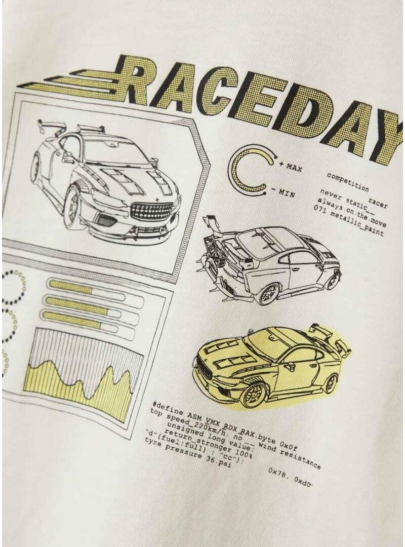 Maglietta Name It. Modello Mobay. Colore beige. Collo rotondo. Manica lunga. Vestibilità regolare. Illustrazione 'Raceday' stampata sul davanti. Dettagli in verde.