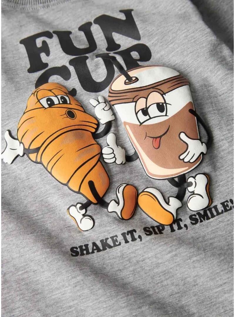 Maglietta Name It. Modello Rasmus. Colore grigio. Tessuto mélange. Collo rotondo. Manica lunga. Vestibilità regolare. Spalla cadente. Illustrazione stampata sul davanti.