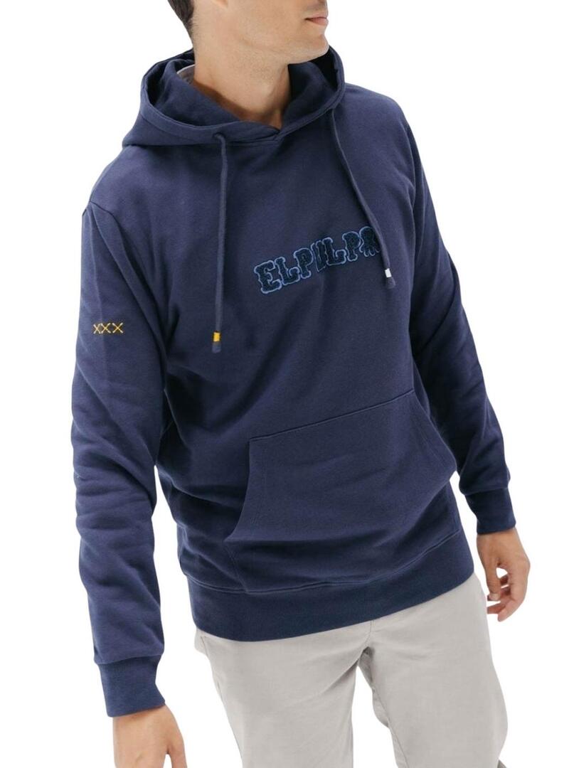 Felpa El Pulpo. Colore blu. Manica lunga. Con cappuccio. Tessuto lavato. Tasca a marsupio. Logo Il Polpo in rilievo sul petto. Finiture a costine. Tre croci ricamate su una manica. Il modello indossa la taglia L.