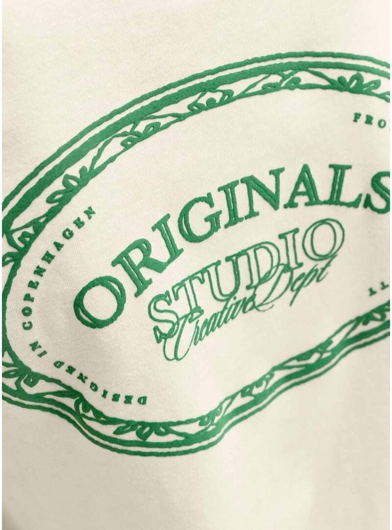 Maglietta Jack and Jones Greene Branding. Colore beige. Collo rotondo. Vestibilità larga. Manica corta. Logo Originals stampato sul petto e sulla schiena con dettagli in verde.
