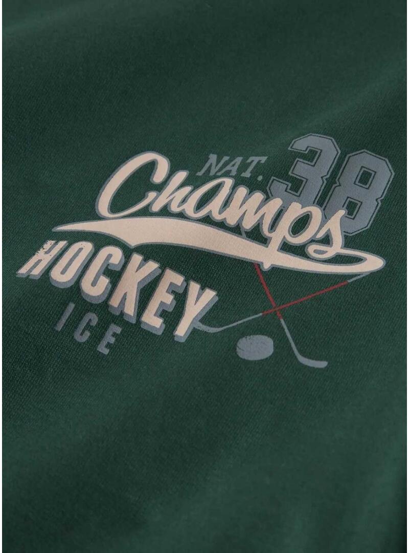 Felpa Name It. Modello Saul. Colore verde. Girocollo. Manica corta. Vestibilità regolare. Orli a costine. Illustrazione Hockey stampata sul petto e sulla schiena.