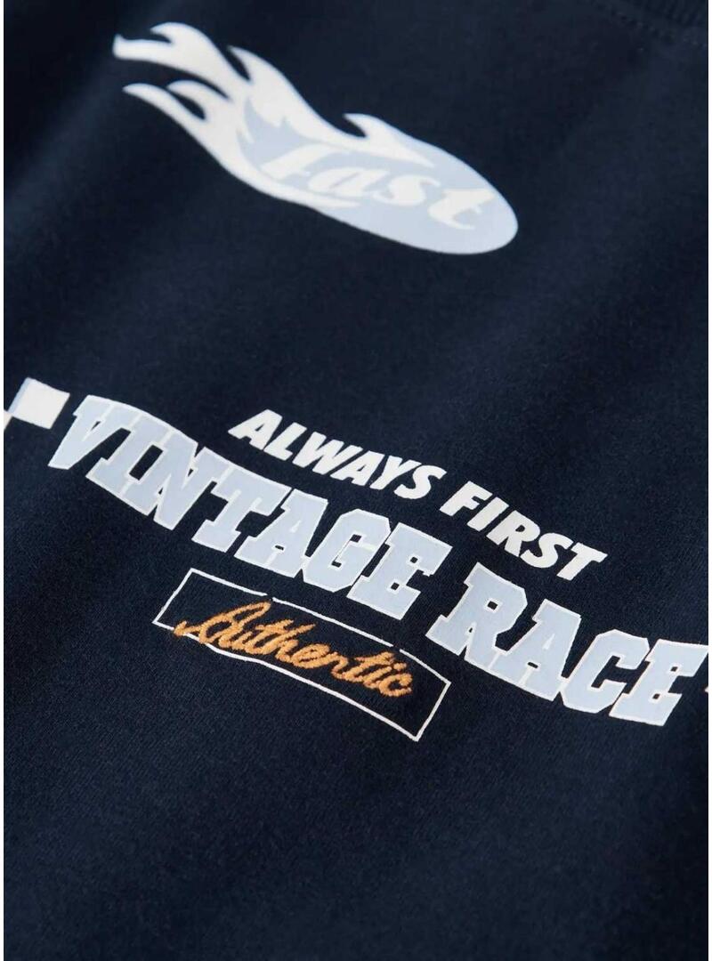 Maglietta Name It. Modello Richael. Colore blu scuro. Collo rotondo. Manica lunga. Vestibilità ampia. Effetto doppia maglietta. Messaggio racing stampato sul petto.