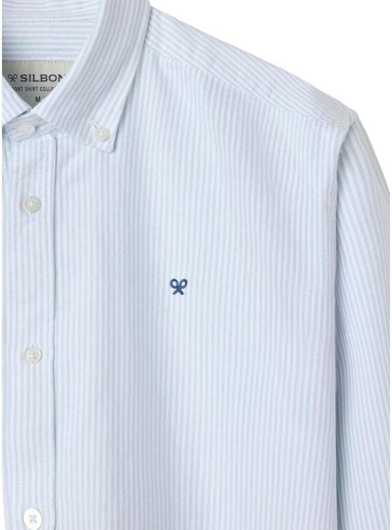 Camicia Silbon. Modello sport. Tessuto oxford. Stampato a righe verdi. Colletto con bottoni. Chiusura con bottoni personalizzati. Manica lunga. Racchette ricamate sul petto. Il modello indossa la taglia M.