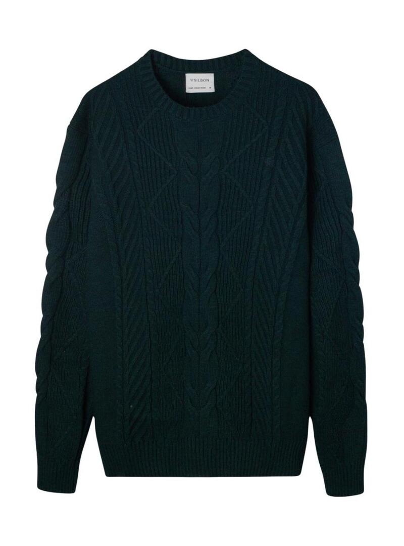 Maglione Silbon. Colore verde. Realizzato con misto lana. Maglia a treccia. Collo rotondo. Manica lunga. Ricamo di racchette sul petto. Finiture a costine. Il modello indossa la taglia M.