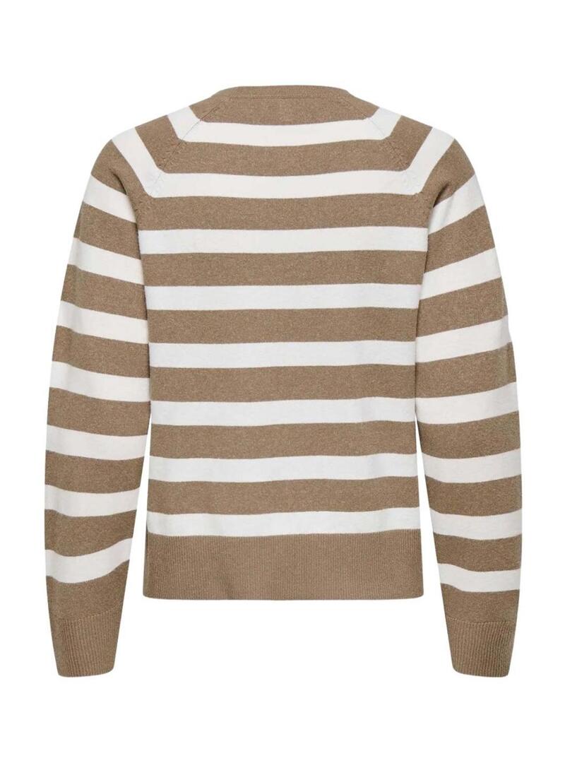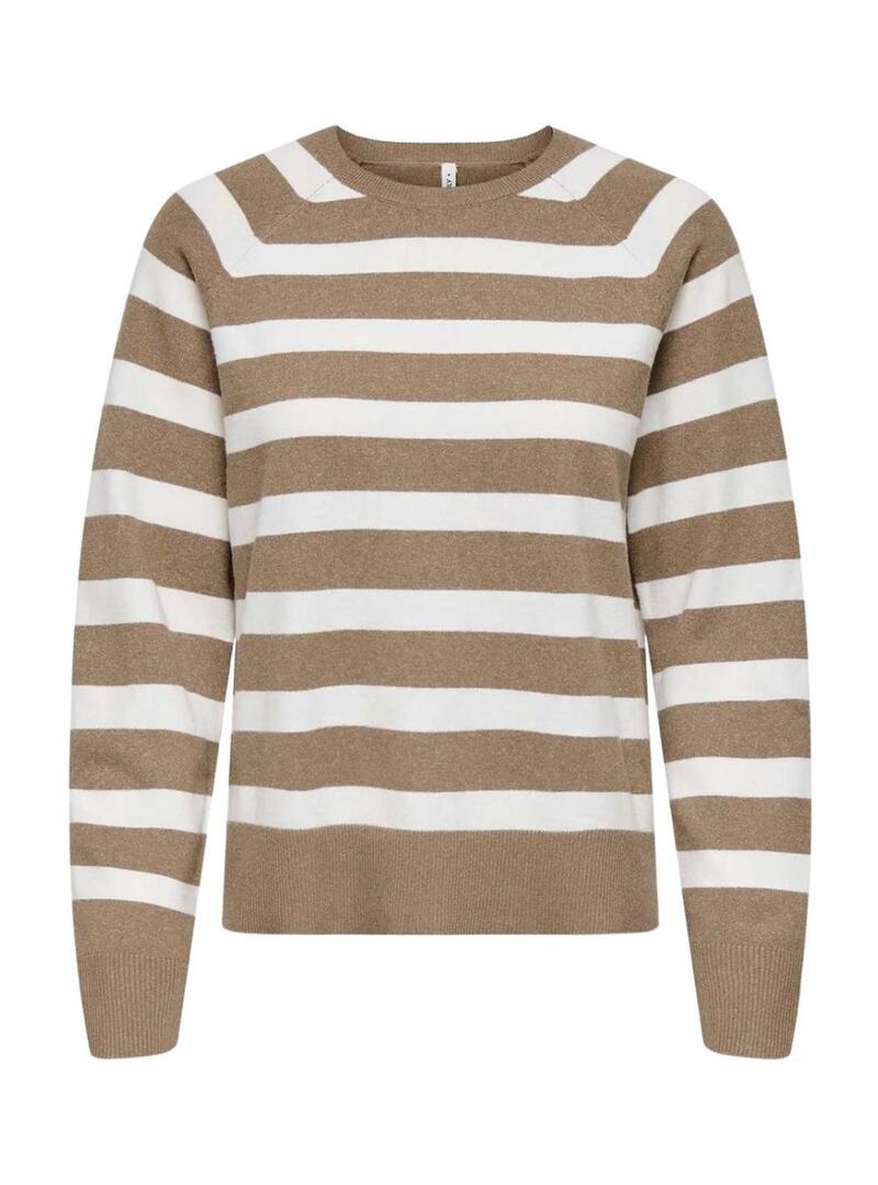 Maglia Only. Colore tostato. Righe bianche stampate. Collo rotondo. Manica lunga. Tessuto a maglia morbida. Taglio regolare. La modella indossa la taglia S.