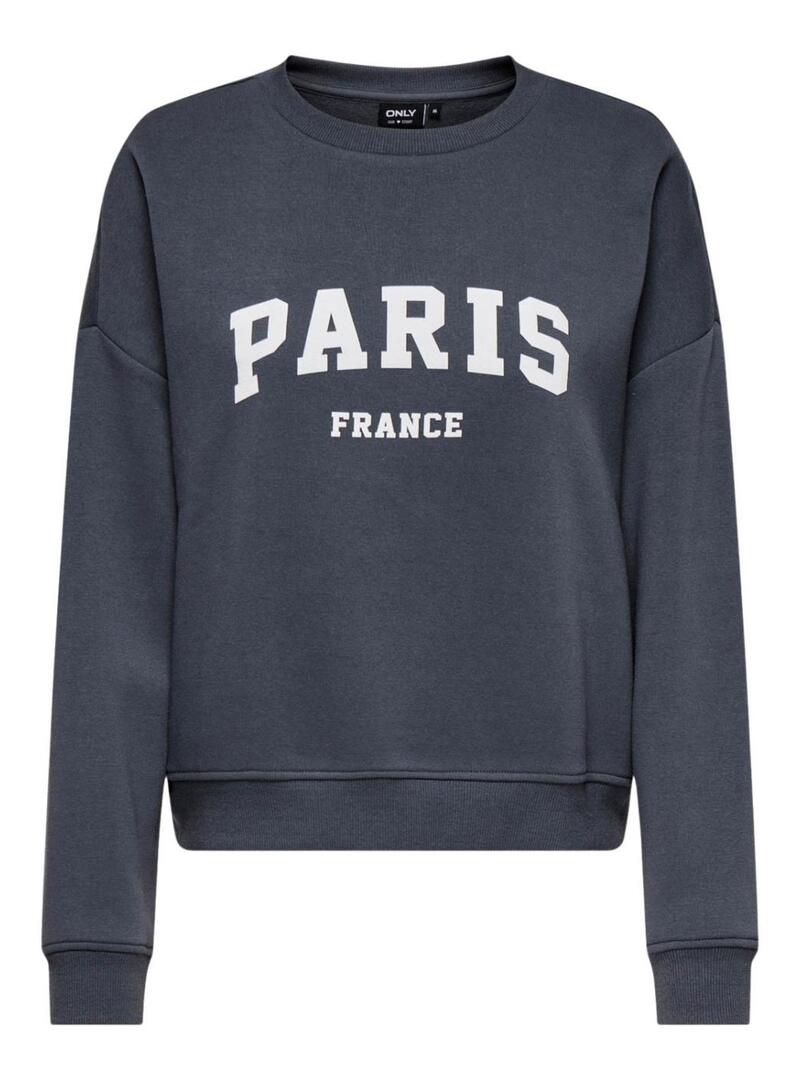 Felpa Only. Modello Onlsweat Life. Colore blu navy. Collo rotondo. Spalle cadenti. Orli a costine. Taglio largo. Grafica stampata sul petto.