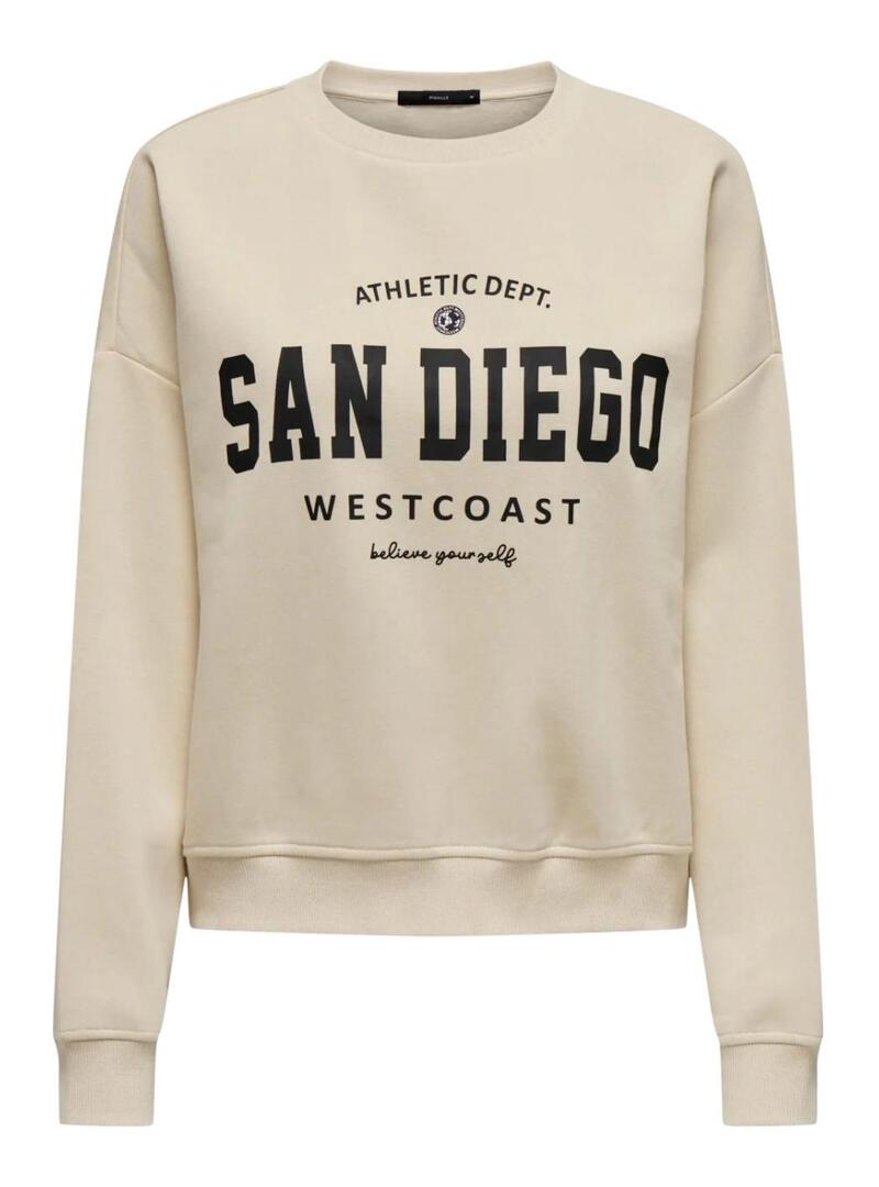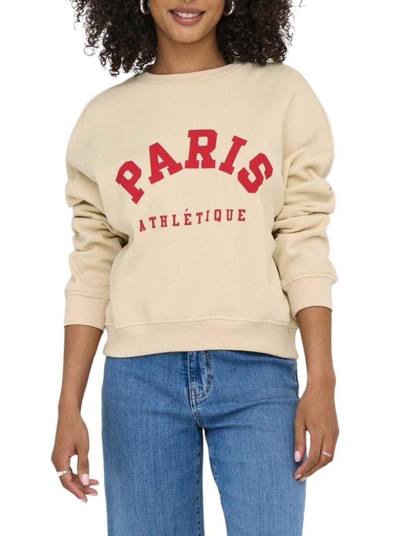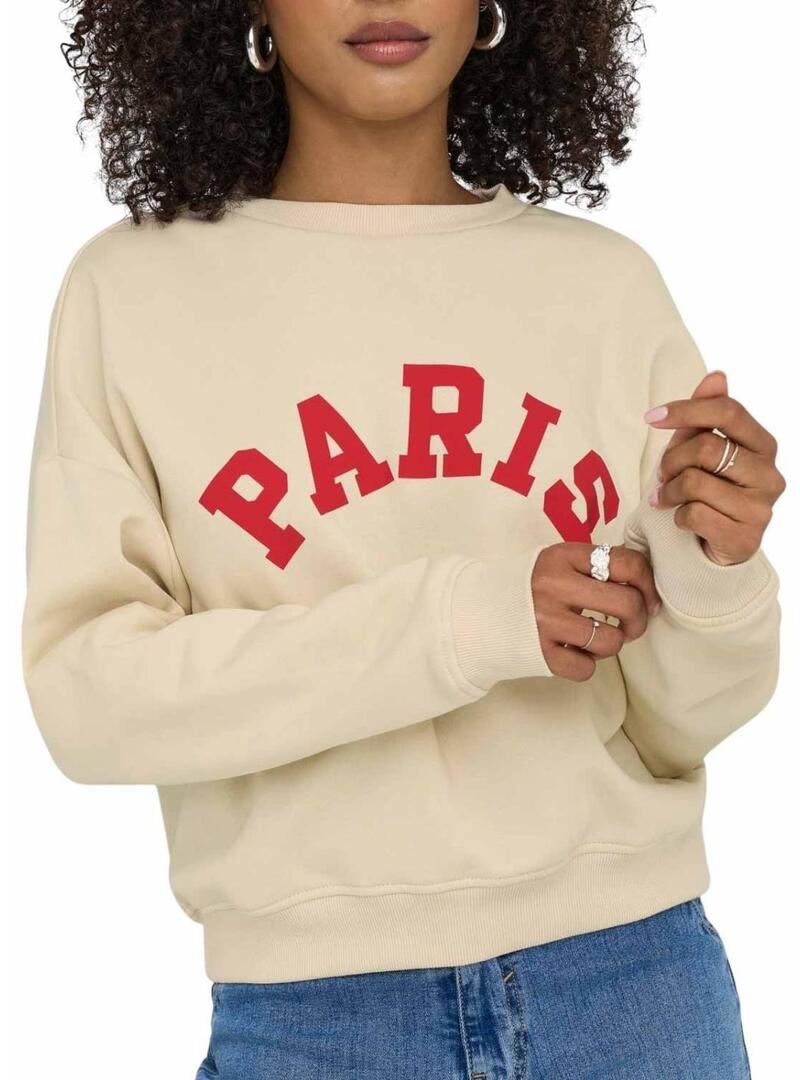Felpa Only. Modello Onlsweat Life. Colore beige. Girocollo. Spalle cadenti. Finiture a costine. Taglio ampio. Grafica Parigi stampata sul petto.