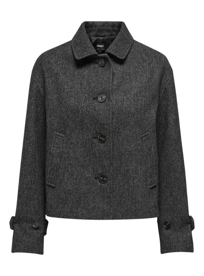 Restituiscimi solo la traduzione in italiano di questo: Giacca Only. Modello Lasta. Colore grigio mélange. Chiusura con bottoni. Taglio dritto. Lunghezza all'anca. Tasche laterali. Tessuto in lana cotta.
