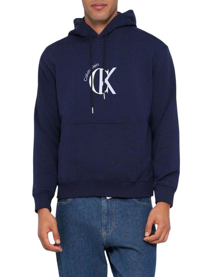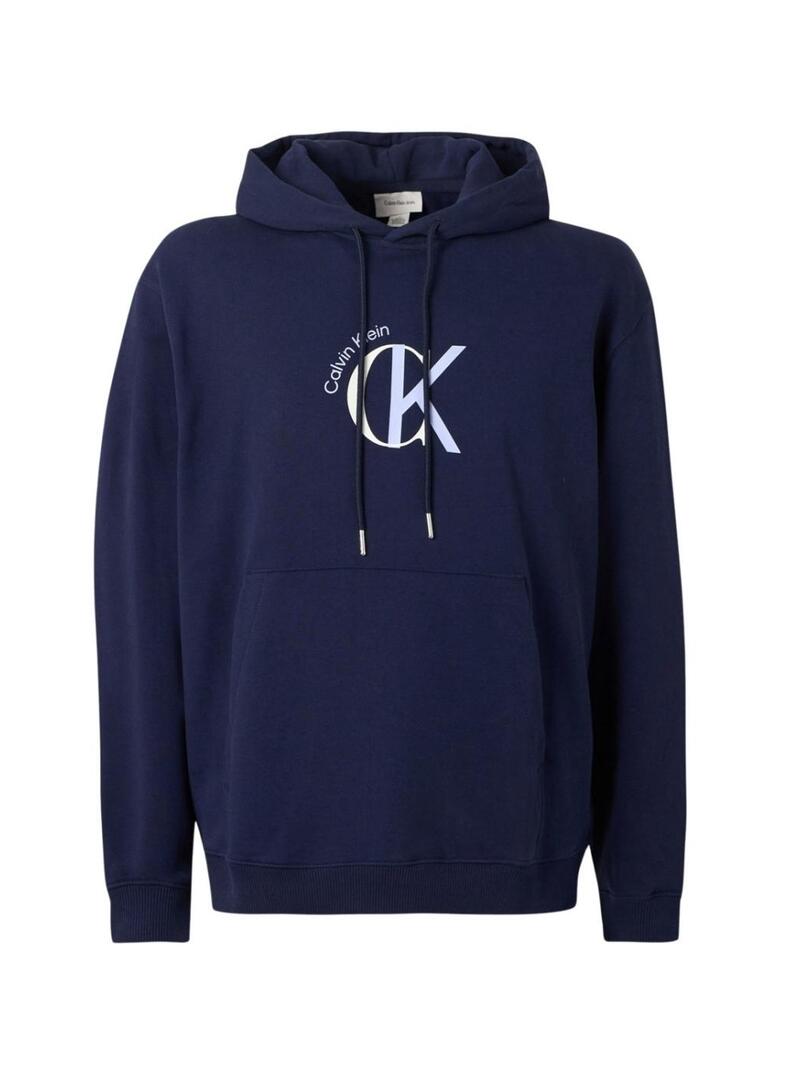 Felpa Calvin Klein. Modello Graphic Hoodie. Colore blu scuro. Cappuccio regolabile con coulisse. Tasca a marsupio. Logo stampato sul petto. Orli a costine.