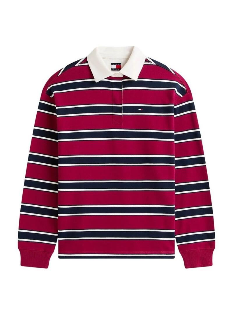 Polo Tommy Jeans. Modello a righe rugby. Colore rosso, bianco e blu scuro. Stampato con righe orizzontali. Colletto con bottoni. Manica lunga. Vestibilità ampia. Marchio ricamato.
