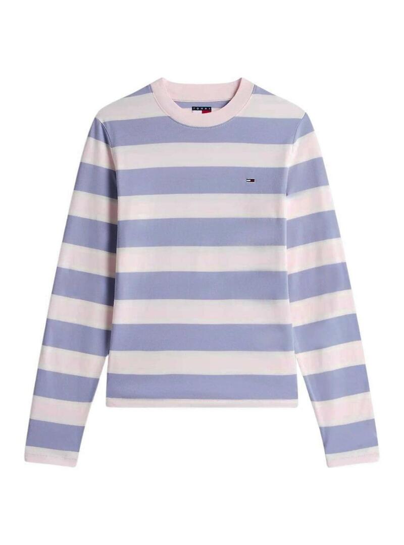 Maglietta Tommy Jeans. Modello a righe orizzontali stampate. Colore lilla e rosa. Scollo rotondo. Manica lunga. Logo ricamato sul petto. Vestibilità dritta.