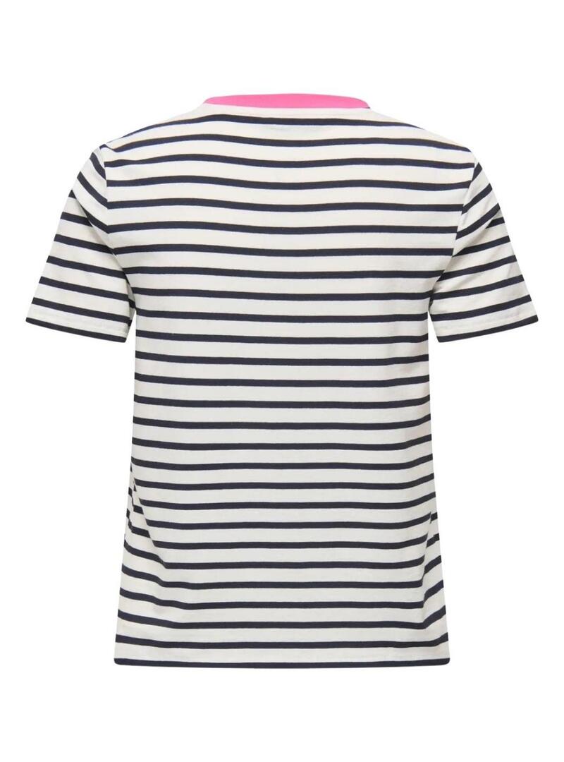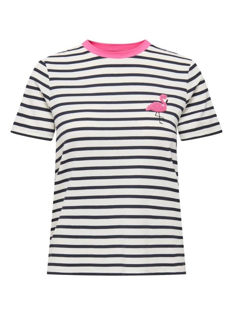Maglietta Only. Modello Heart. Colore blu e bianco. Tessuto con stampa a righe orizzontali. Collo rotondo in contrasto rosa. Manica corta. Fenicottero ricamato sul petto.