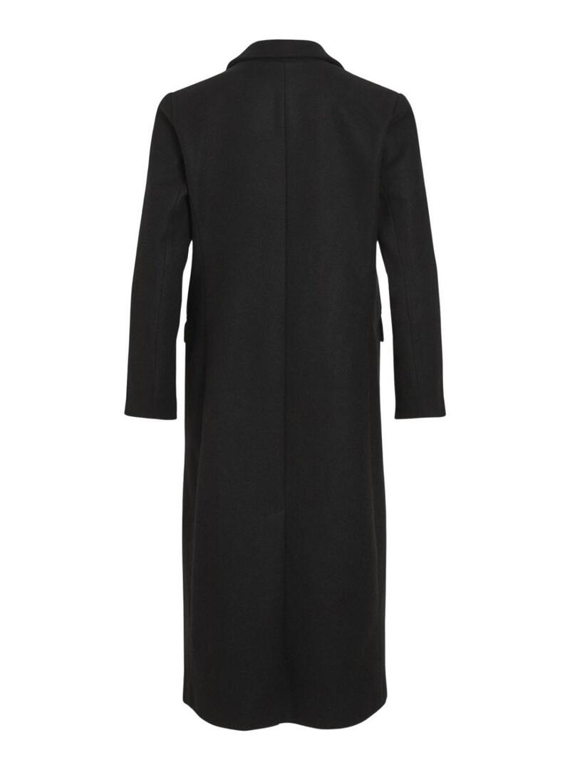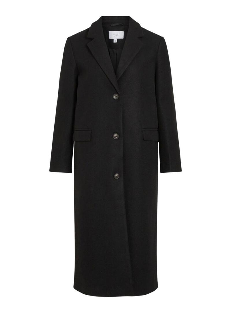 Restituiscimi solo la traduzione in italiano di ciò: Cappotto Vila. Modello Visolo. Colore nero. Taglio dritto. Chiusura con tre bottoni. Tasche laterali a filetto con patta. Vestibilità regolare.