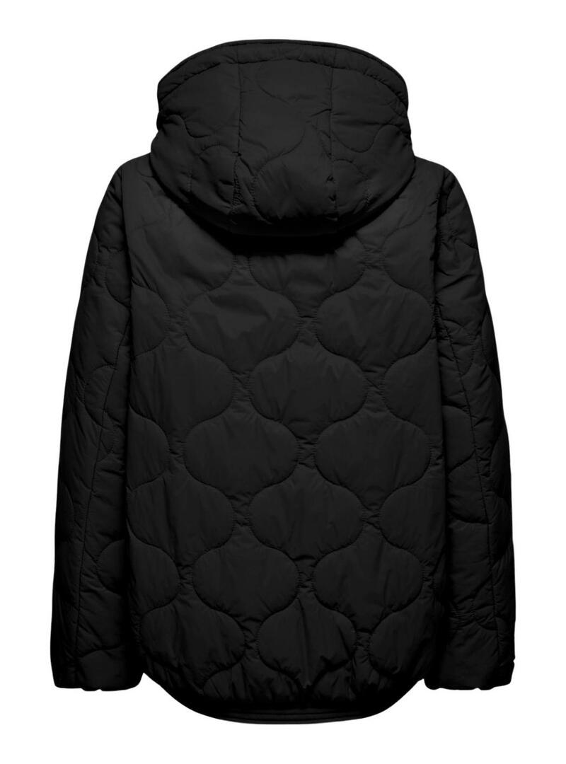 Giacca Only. Modello Miki. Colore nero. Tessuto imbottito geometrico. Vestibilità ampia. Chiusura con zip. Cappuccio con coulisse regolabile. Tasche laterali. Polsini elasticizzati. Vestibilità ampia. Taglio stile mantella. Parte posteriore più lunga rispetto a quella anteriore.
