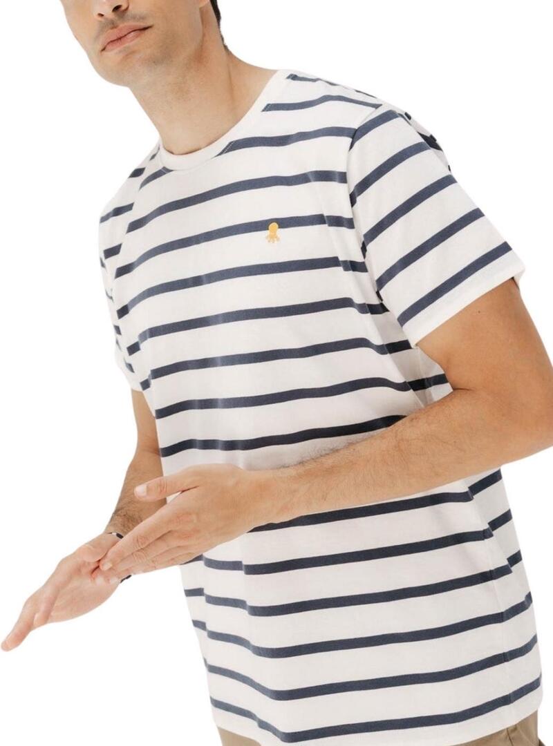 Maglietta El Pulpo. Modello a righe. Colore bianco e blu scuro. Stile basico. Logo ricamato sul petto in colore giallo. Manica corta. Vestibilità regolare. Righe in direzione orizzontale.
