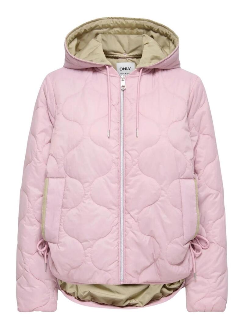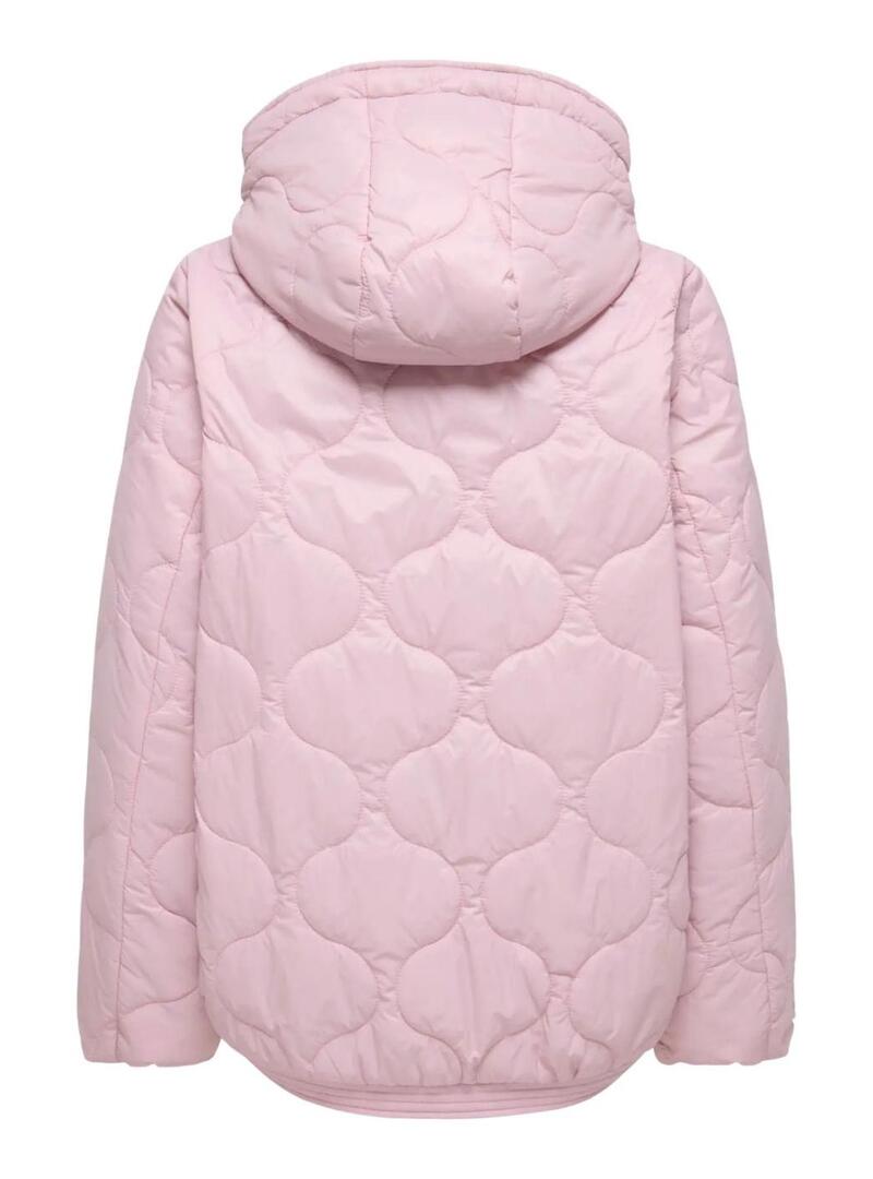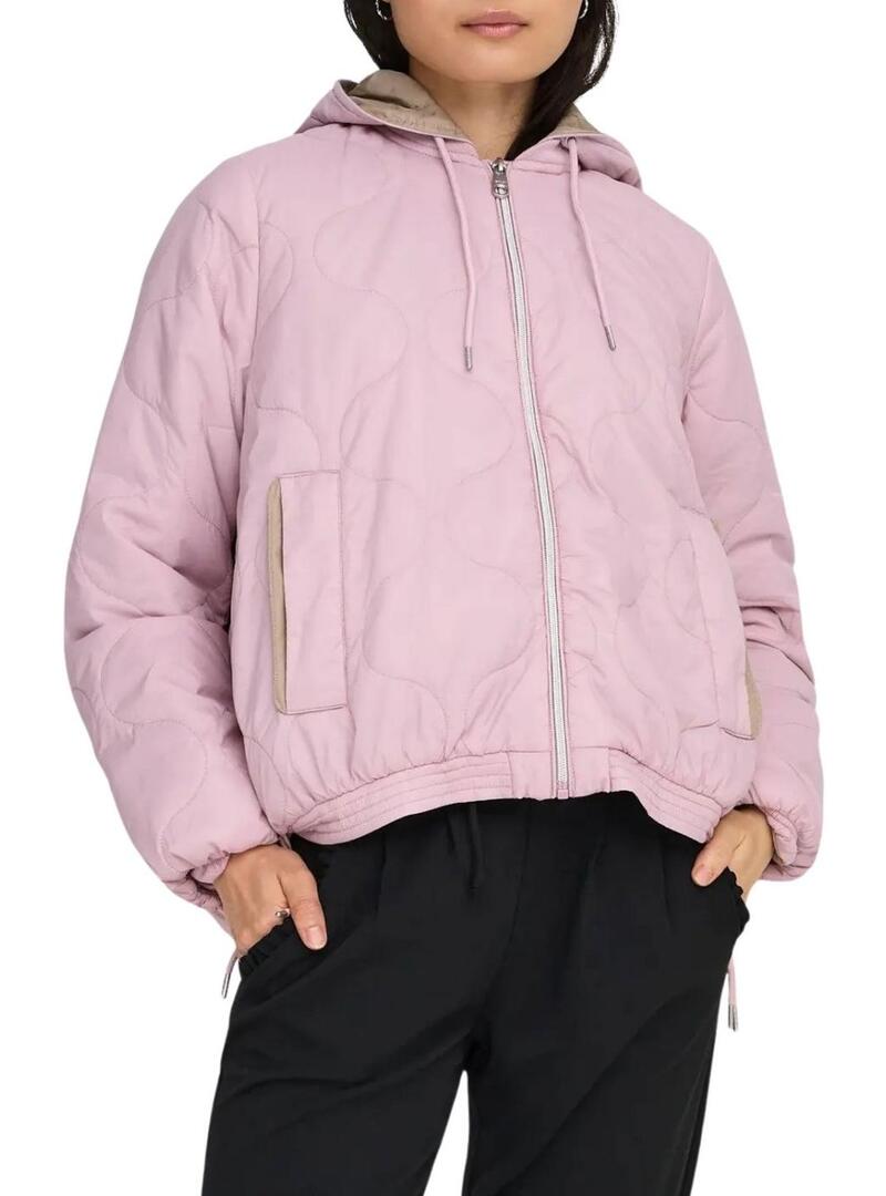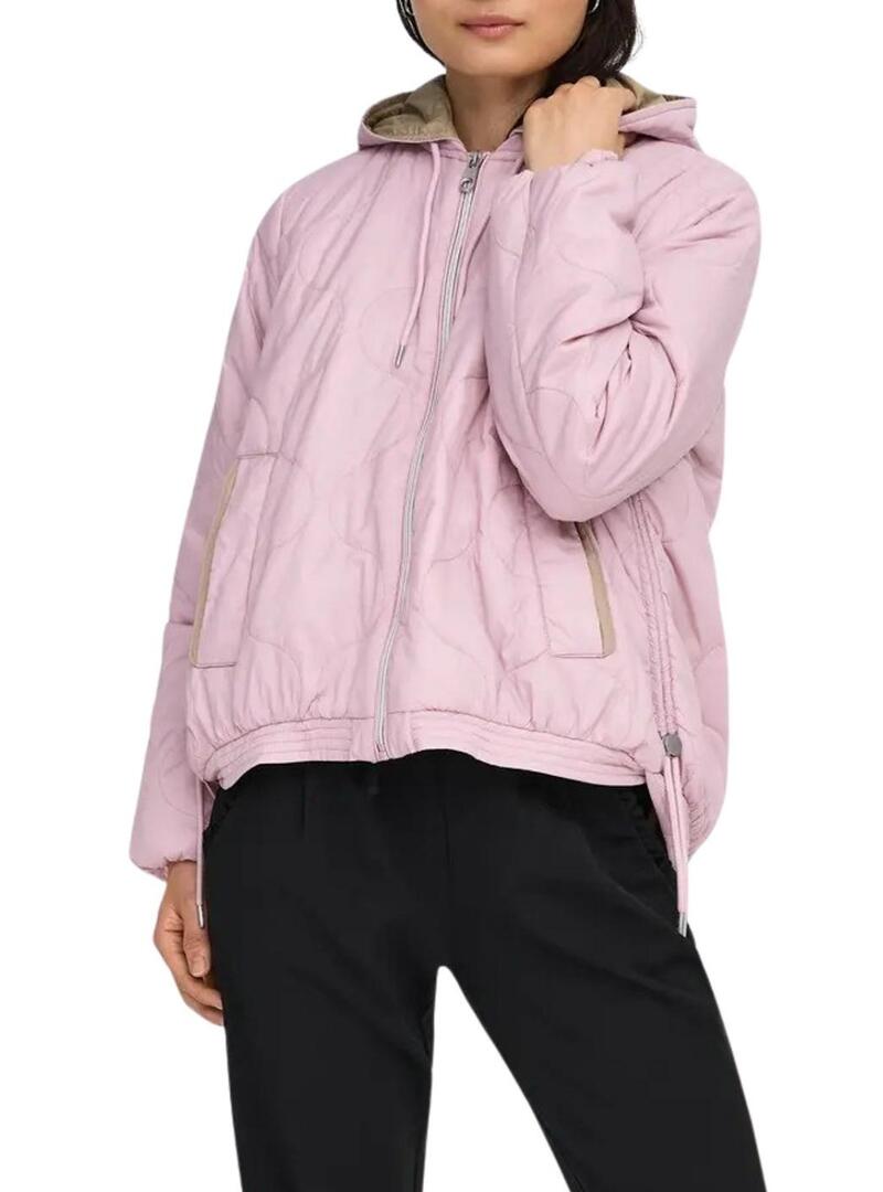 Giacca Only. Modello Miki. Colore rosa con fodera beige. Tessuto trapuntato geometrico. Vestibilità ampia. Chiusura con zip. Cappuccio con coulisse regolabile. Tasche laterali. Estremità elastiche. Vestibilità ampia. Taglio stile mantella. Parte posteriore più lunga rispetto a quella anteriore.