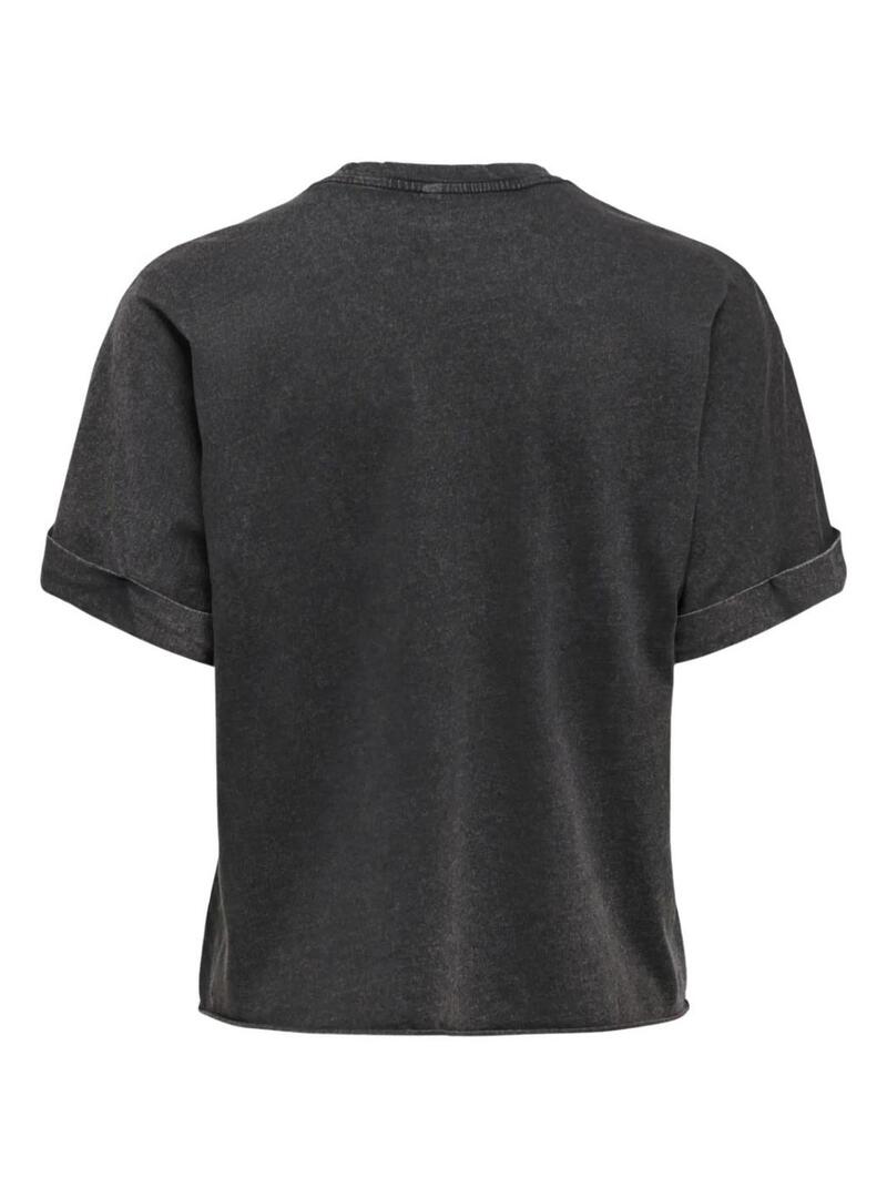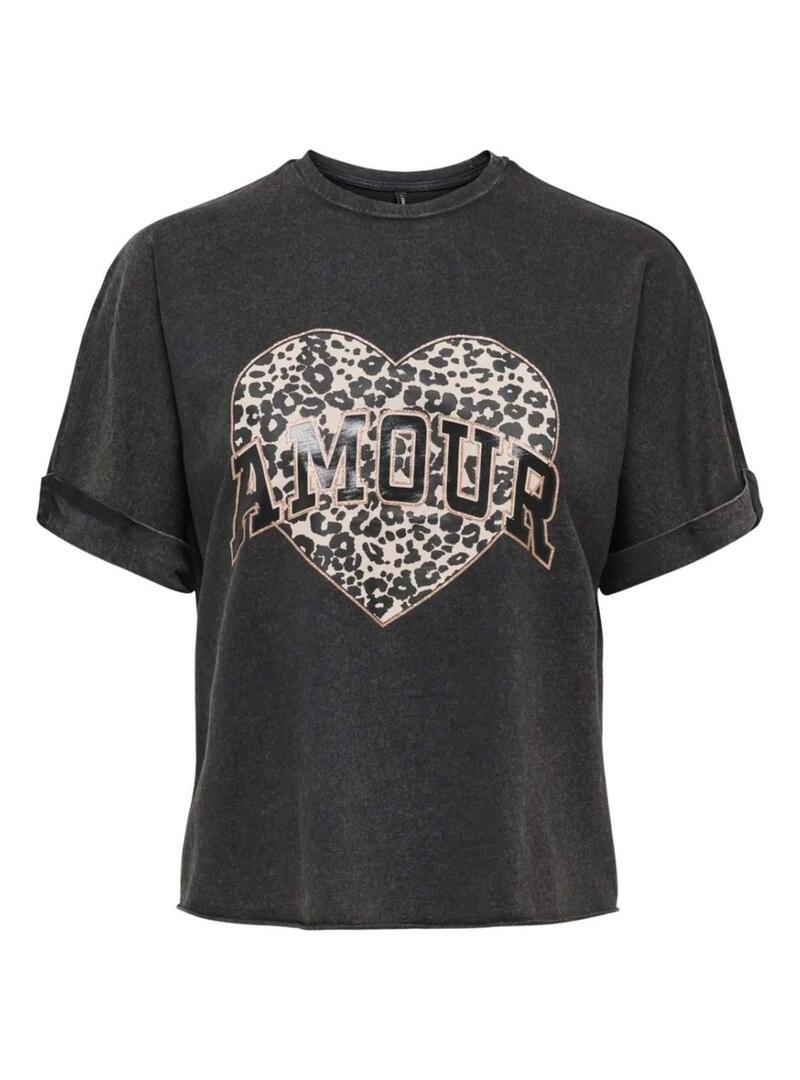 Maglietta Only. Modello Lucy. Colore nero. Effetto consumato. Collo rotondo. Vestibilità comoda. Manica corta con risvolto. Cuore con stampa animalier stampato sul petto con scritta Amour.
