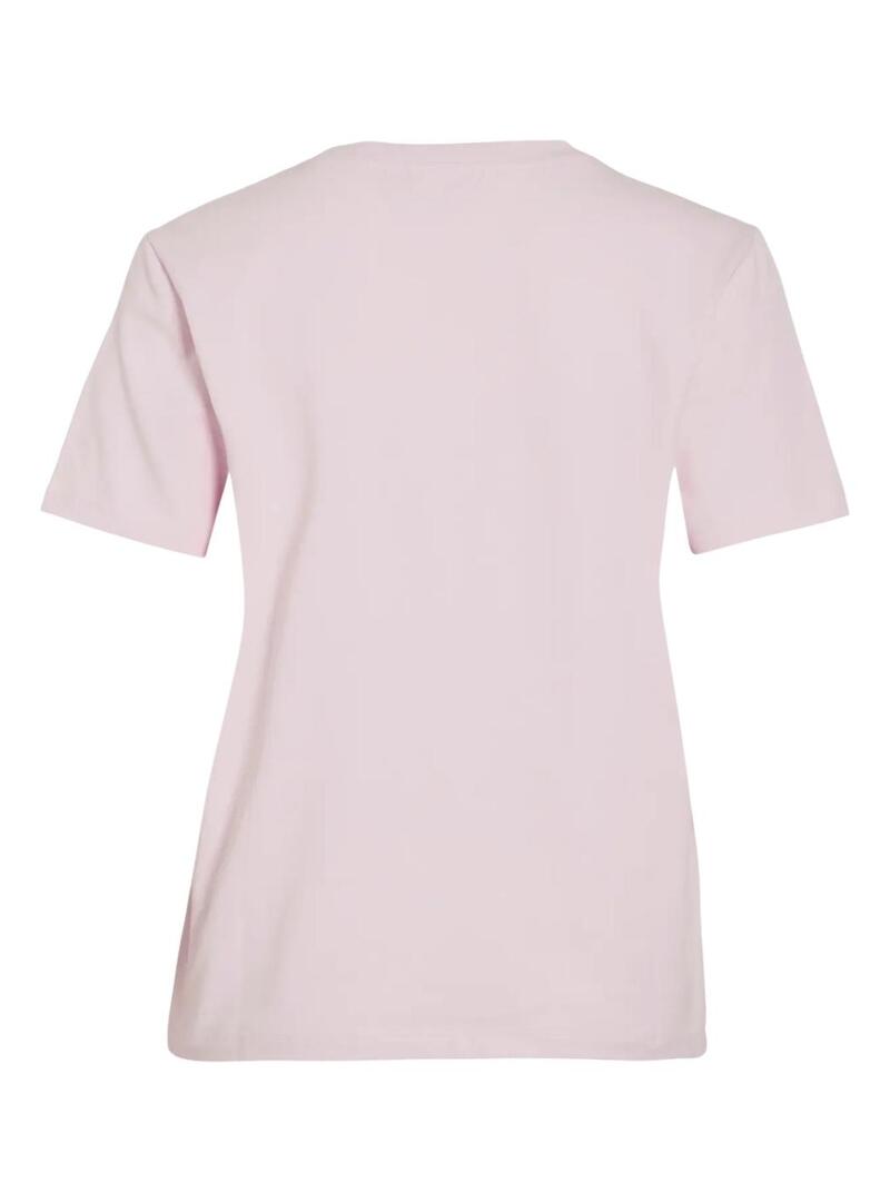 Maglietta Vila. Modello Vinora. Colore rosa. Colletto rotondo. Manica corta. Taglio dritto. Messaggio stampato sul petto: Self love superpower.