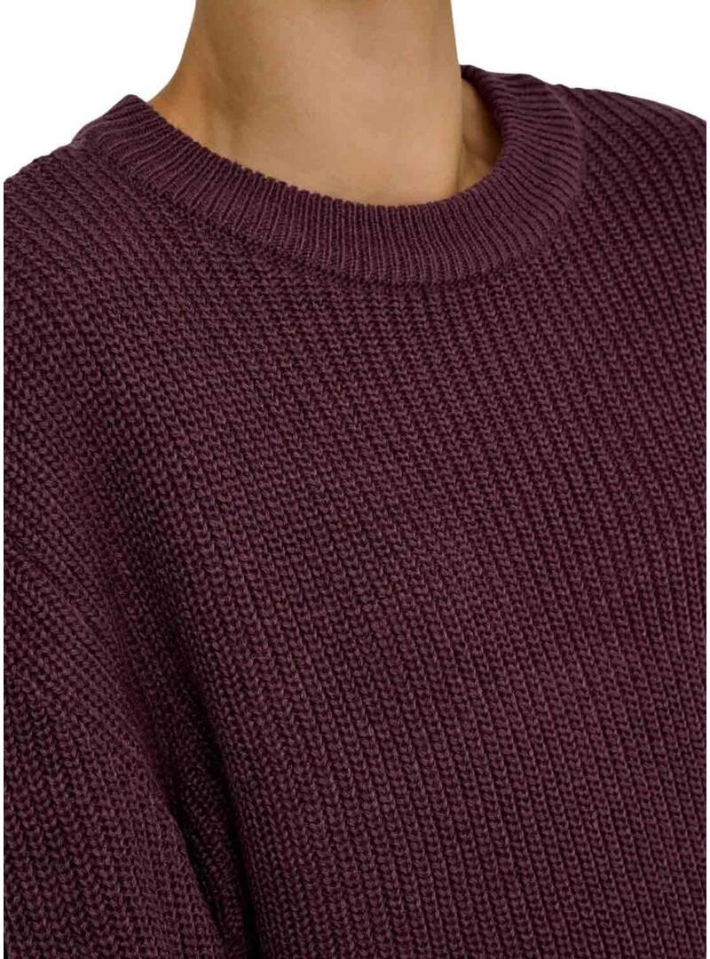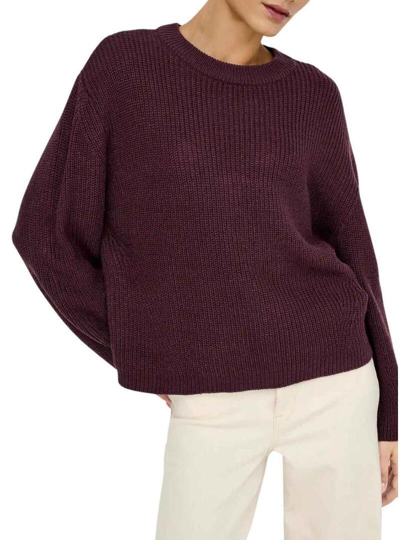 Maglia Only. Modello Milouz. Colore granato. Collo rotondo. Manica lunga. Vestibilità dritta. Tessuto a maglia spessa in rilievo. Spalle cadenti. Stile basic.