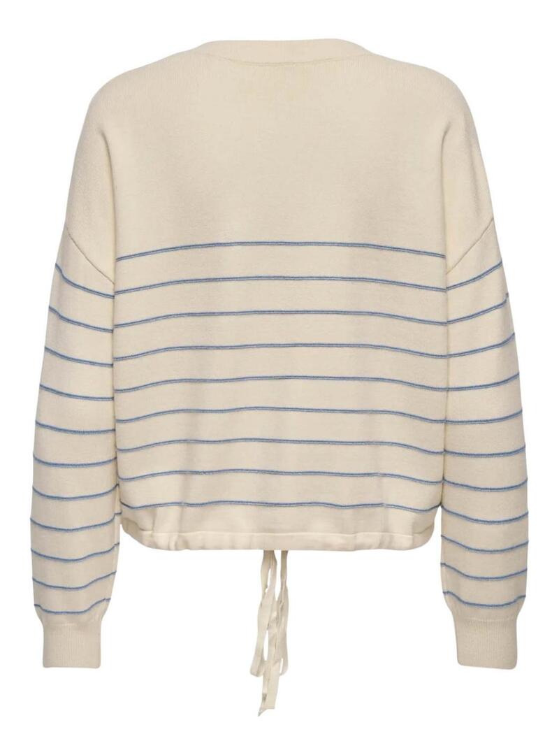 Maglia Only. Modello Signe. Colore bianco. Girocollo ampio. Spalle cadenti. Vestibilità ampia. Righe in colore blu. Estremità delle maniche a coste. Fondo con coulisse regolabile. Messaggio sul petto.