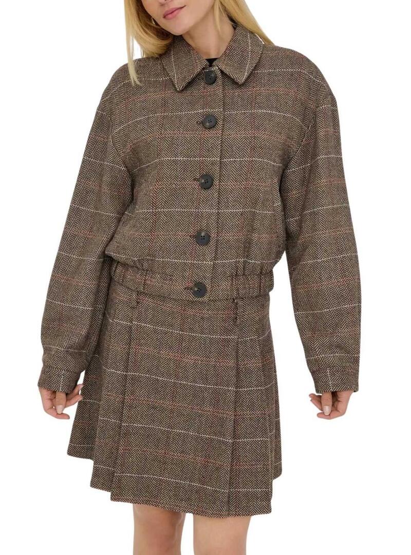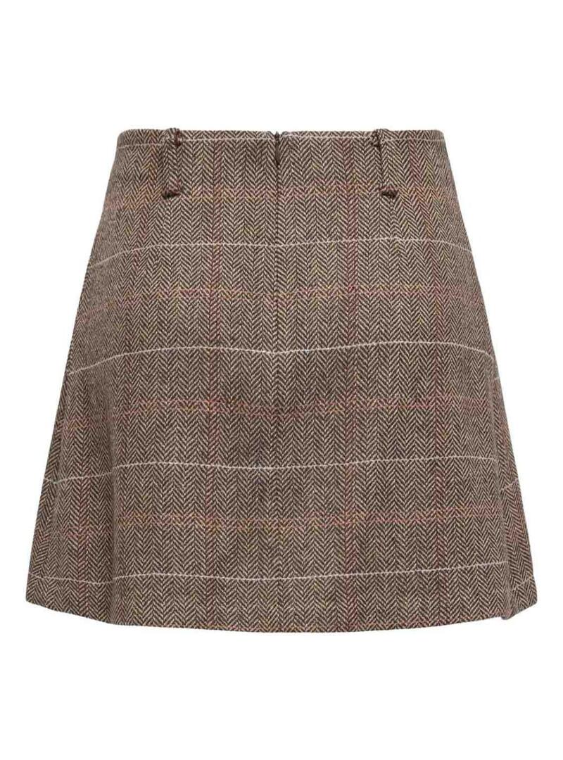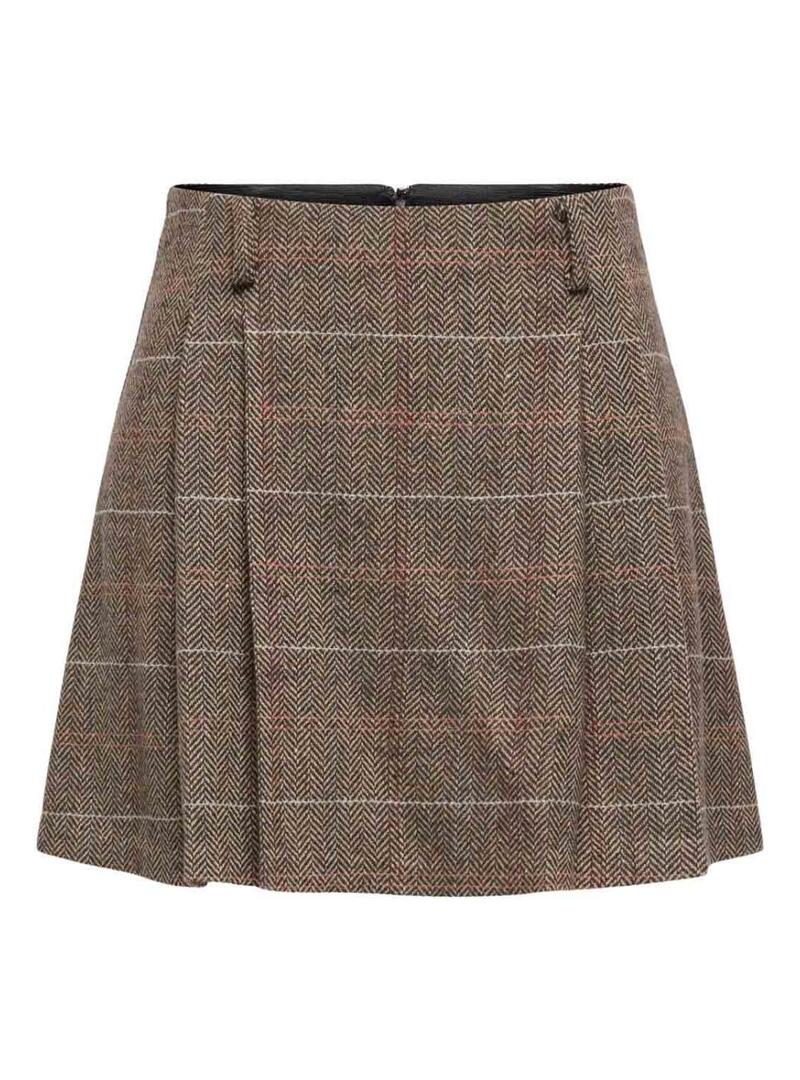 Gonna Only. Modello Ricca. Colore marrone. Stampato geometrico. Chiusura con zip posteriore. Taglio a pieghe. Lunghezza mini. Tessuto in lana.