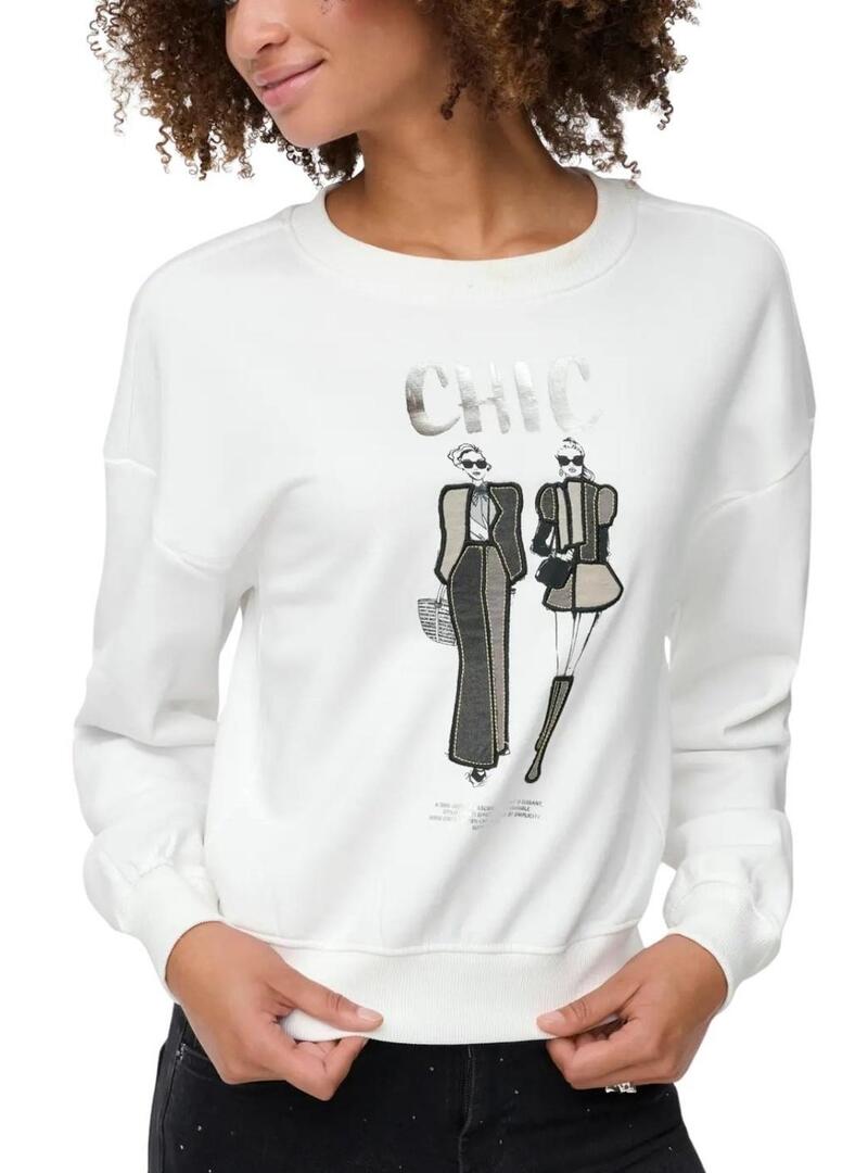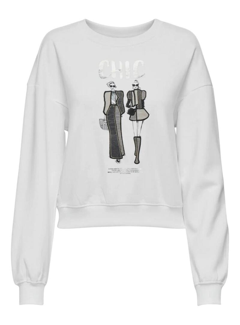 Felpa Only. Modello Emily. Colore bianco. Collo rotondo. Orli a costine. Vestibilità regolare. Spalle cadenti. Illustrazione stampata sul davanti.