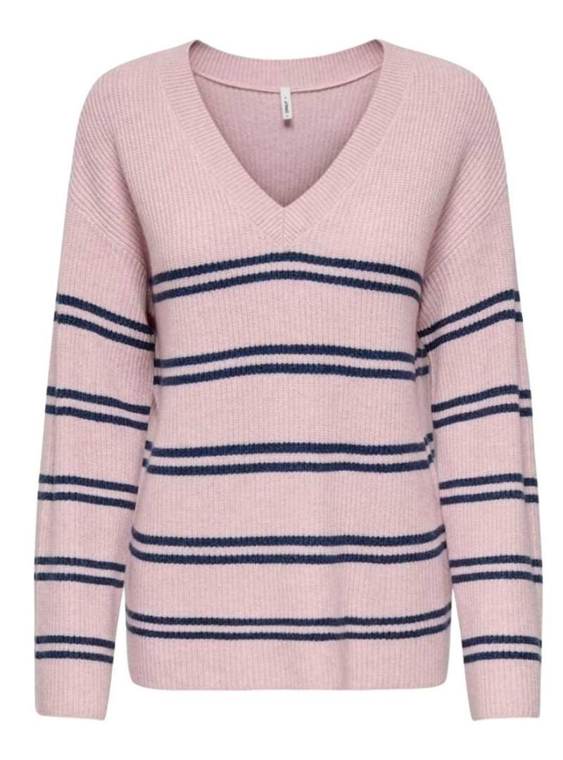 Maglia solo. Modello Libi. Colore rosa chiaro. Scollatura a V. Orli a costine. Vestibilità ampia. Spalle cadenti. Tessuto a righe orizzontali in contrasto blu.