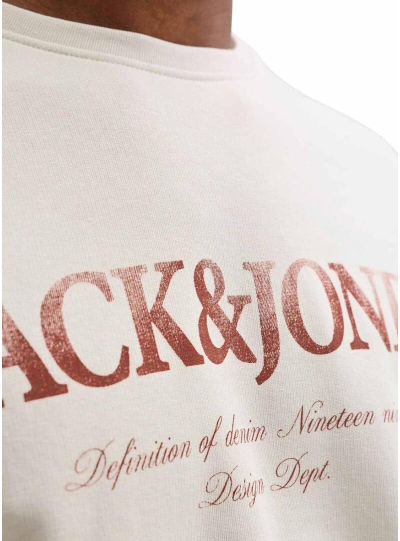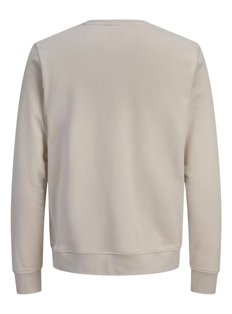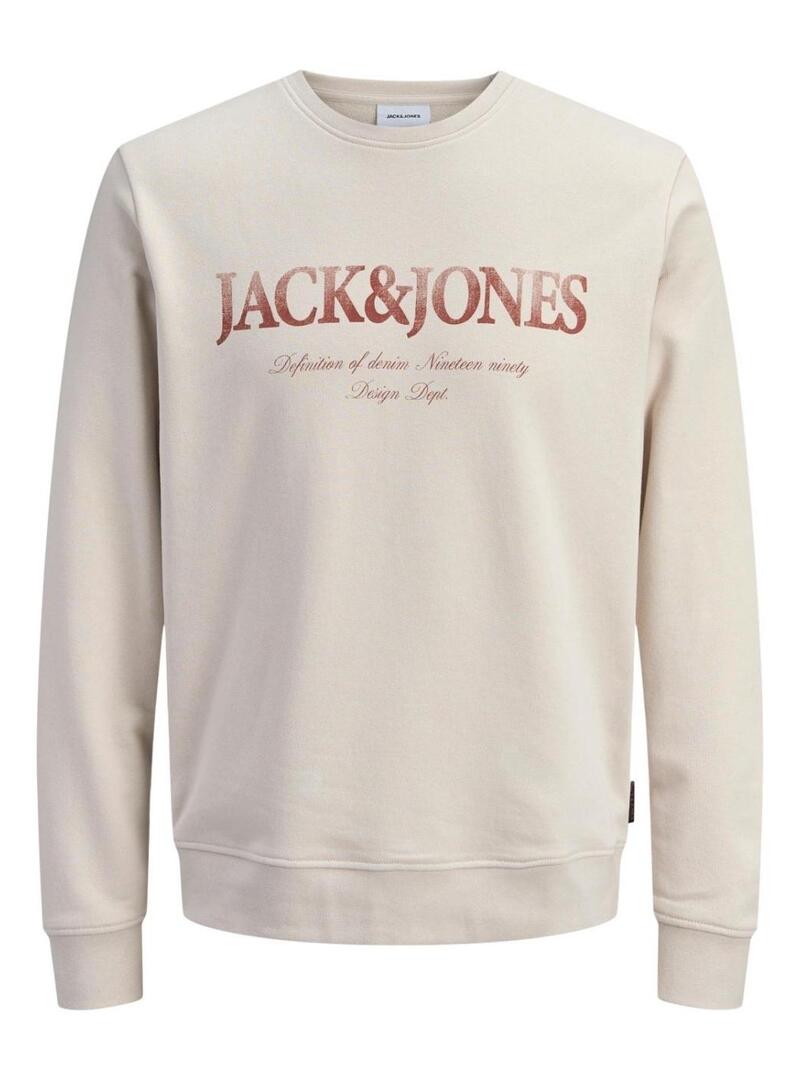 Felpa Jack and Jones. Modello Devin. Colore beige. Collo rotondo. Manica lunga. Orli a costine. Vestibilità regolare. Logo stampato sul petto di colore arancione. Effetto consumato sul logo.