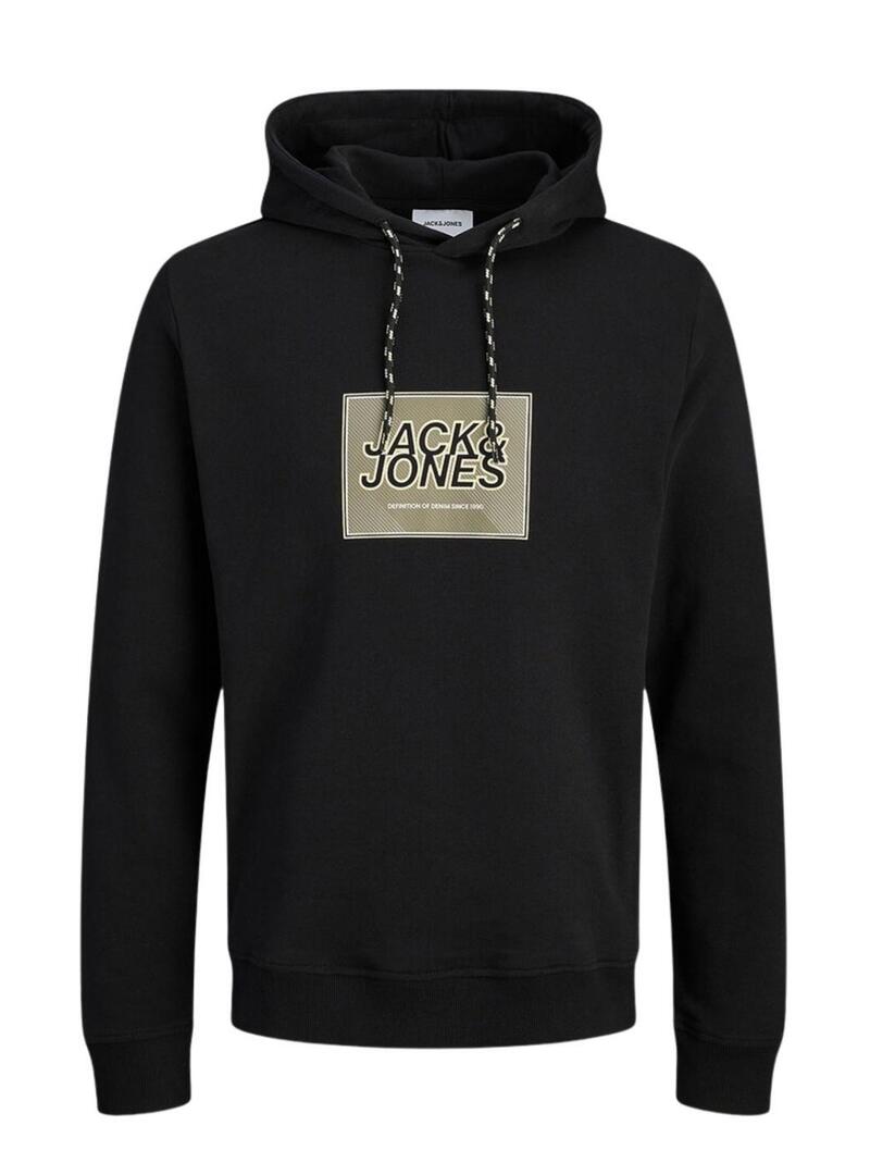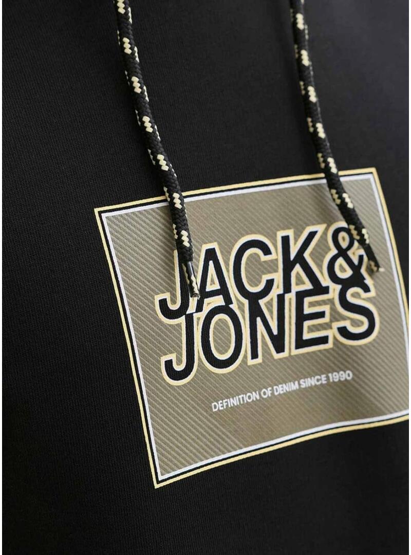 Felpa Jack and Jones. Modello Rain. Colore nero. Cappuccio con lacci regolabili. Orli a costine. Vestibilità regolare. Logo stampato a scatola sul petto.