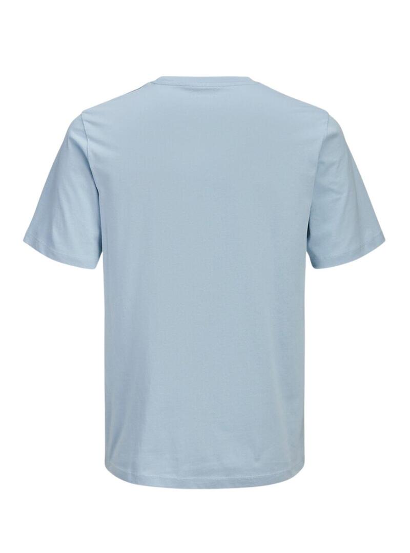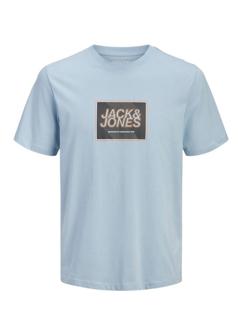 Maglietta Jack and Jones. Modello Rain. Colore blu chiaro. Colletto rotondo. Manica corta. Vestibilità regolare. Logo stampato sul petto a forma di scatola. Dettagli in contrasto.