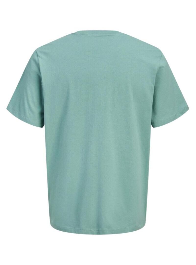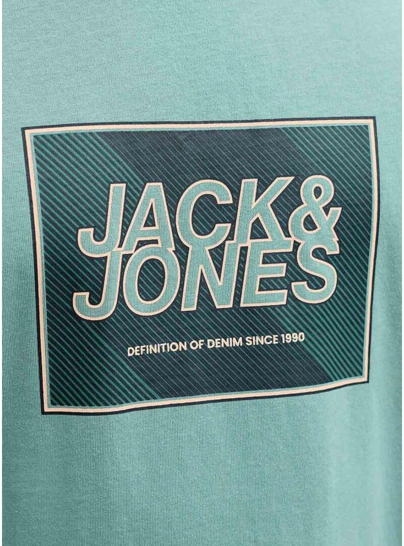 Maglietta Jack and Jones. Modello Rain. Colore turchese. Girocollo. Manica corta. Vestibilità regolare. Logo stampato sul petto a forma di scatola. Dettagli in contrasto di colore.