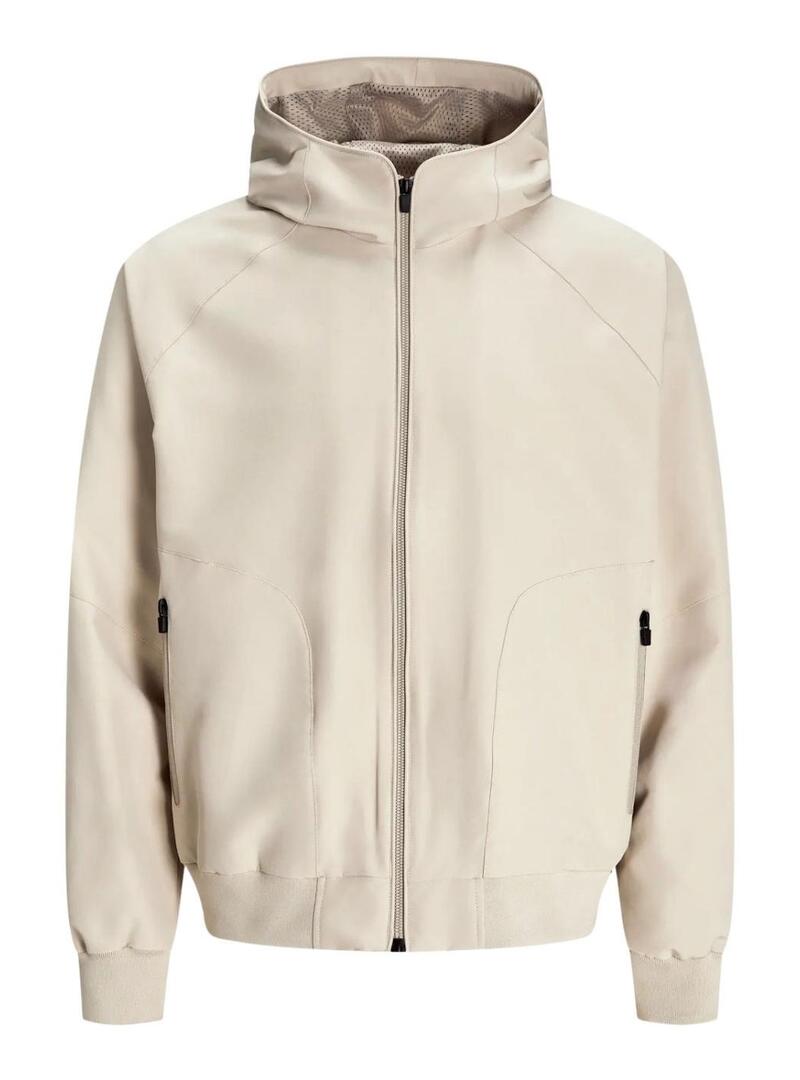 Giacca Jack and Jones. Modello Perfect. Colore beige. Stile bomber. Colletto alto con cappuccio. Chiusura con zip. Orli a costine. Tasche laterali con zip.