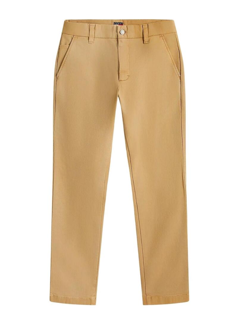 Pantaloni Tommy Jeans. Modello Scanton chino. Colore beige. Chiusura con bottone e zip. Tessuto elasticizzato. Patch del marchio sulla parte posteriore. Tasche laterali. Tasche a filetto posteriori. Taglio dritto.