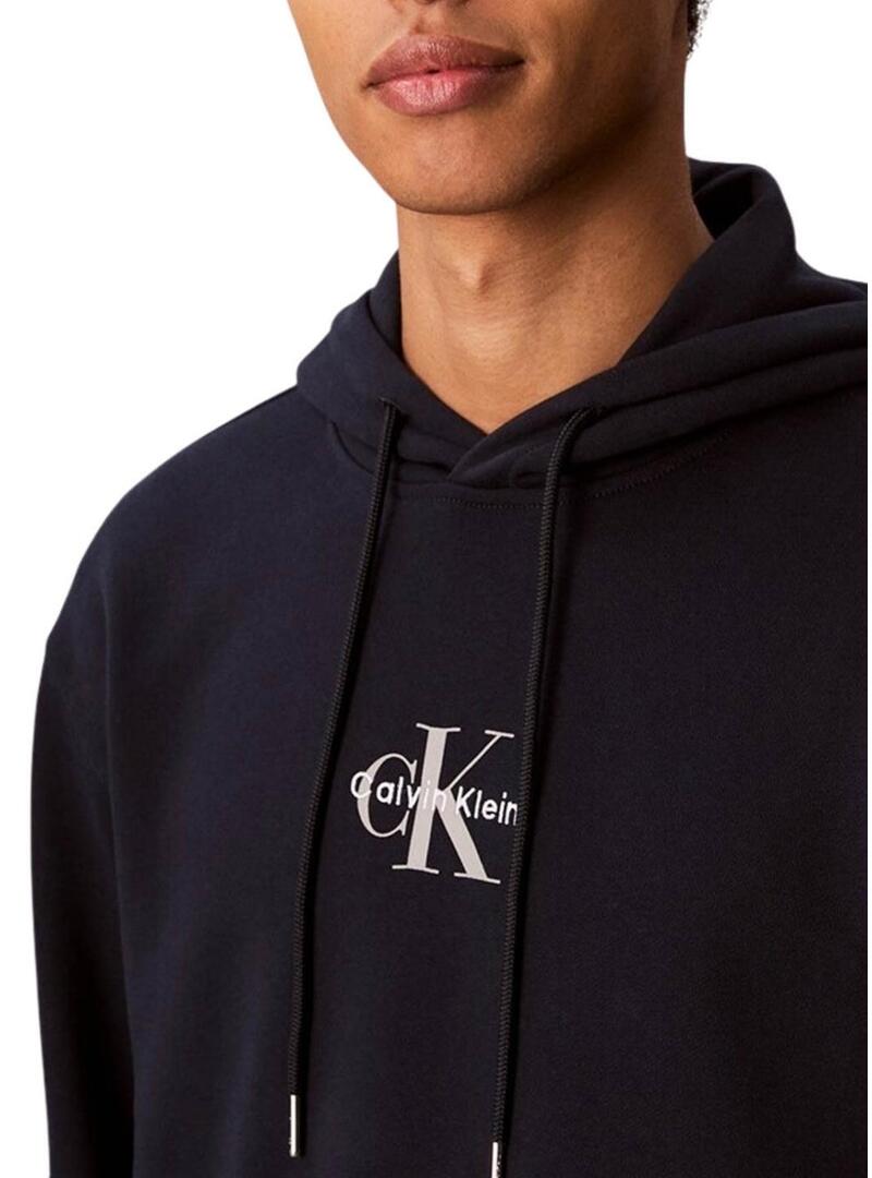 Maglione Calvin Klein Jeans. Modello Micro Monologo. Colore blu scuro. Cappuccio con coulisse regolabile. Logo ricamato sul petto. Orli a costine. Tasca marsupio.