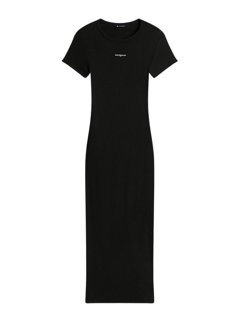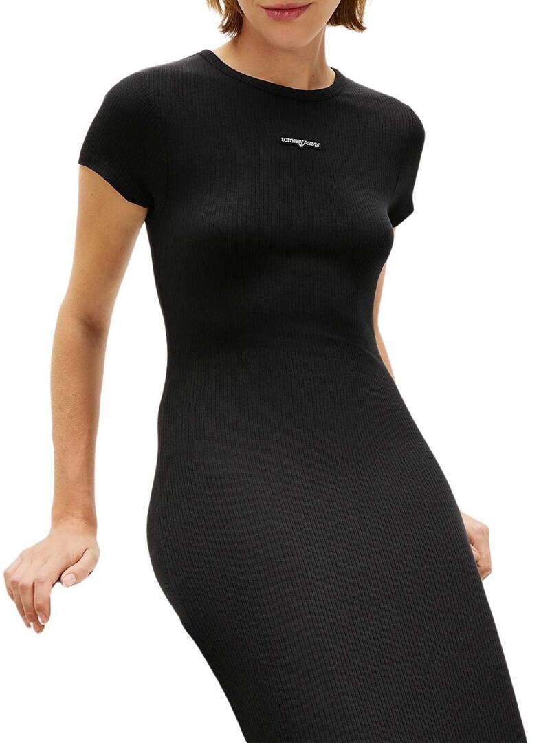 Abito Tommy Jeans. Modello Script. Colore nero. Collo rotondo. Manica corta. Tessuto a coste. Taglio aderente. Elastico. Lunghezza midi. Marchio ricamato sul petto.