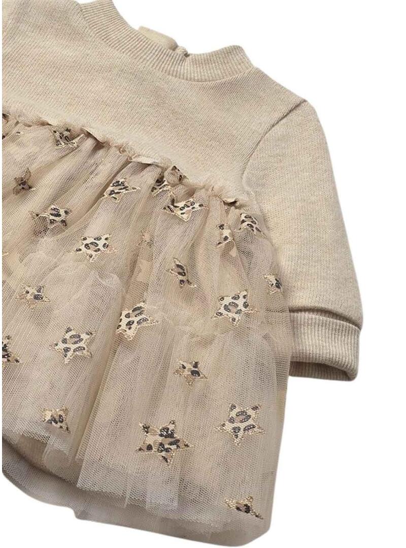 Abito Mayoral. Colore beige. Gonna di tulle con stampe animalier a stelle. Parte superiore in morbido cotone. Chiusura posteriore. Manica lunga.