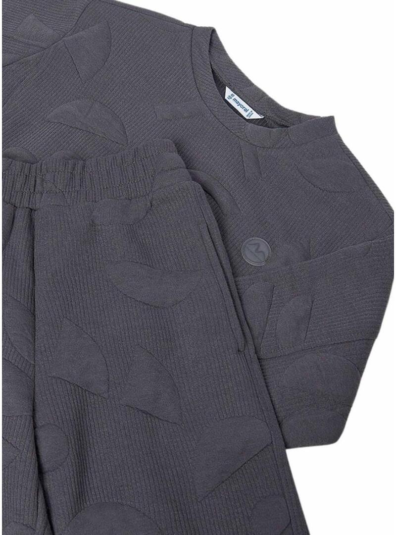 Tuta Mayoral. Tessuto dall'aspetto trapuntato. Colore grigio piombo. Felpa con collo rotondo. Vestibilità comoda. Estremità elastiche. Pantaloni lunghi. Tasche laterali. Vita e fondo elastici.